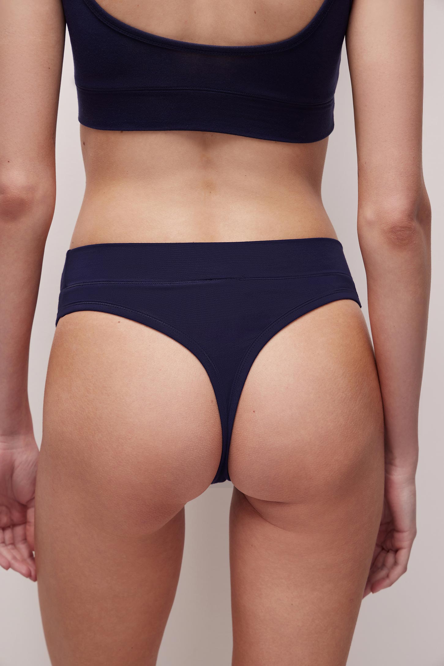 Трусы-стринги с высокой посадкой изготовлены из шелковистого бамбукового трикотажа. Широкий пояс без резинки мягко облегает фигуру. Изделие выполнено с декоративной окантовкой. Вырезы для ног окантованы широкой бейкой без резинки.