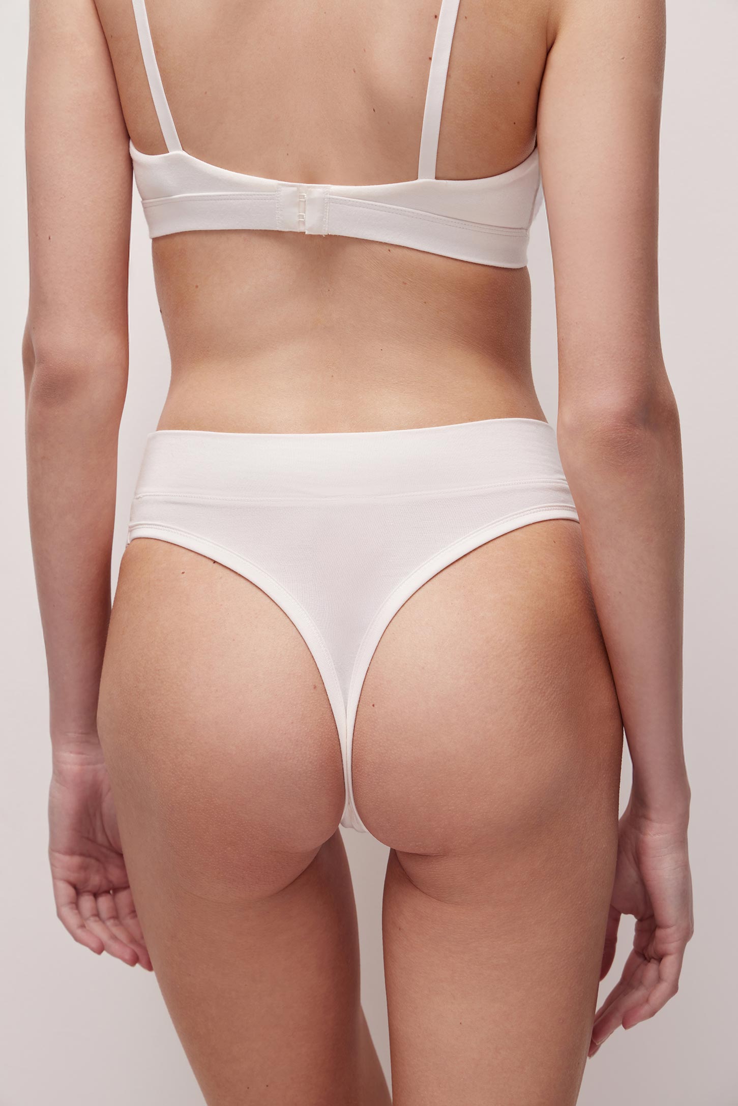 Трусы-стринги с высокой посадкой изготовлены из шелковистого бамбукового трикотажа. Широкий пояс без резинки мягко облегает фигуру. Изделие выполнено с декоративной окантовкой. Вырезы для ног окантованы широкой бейкой без резинки.