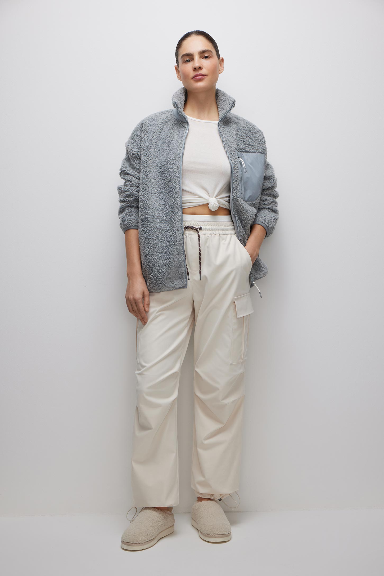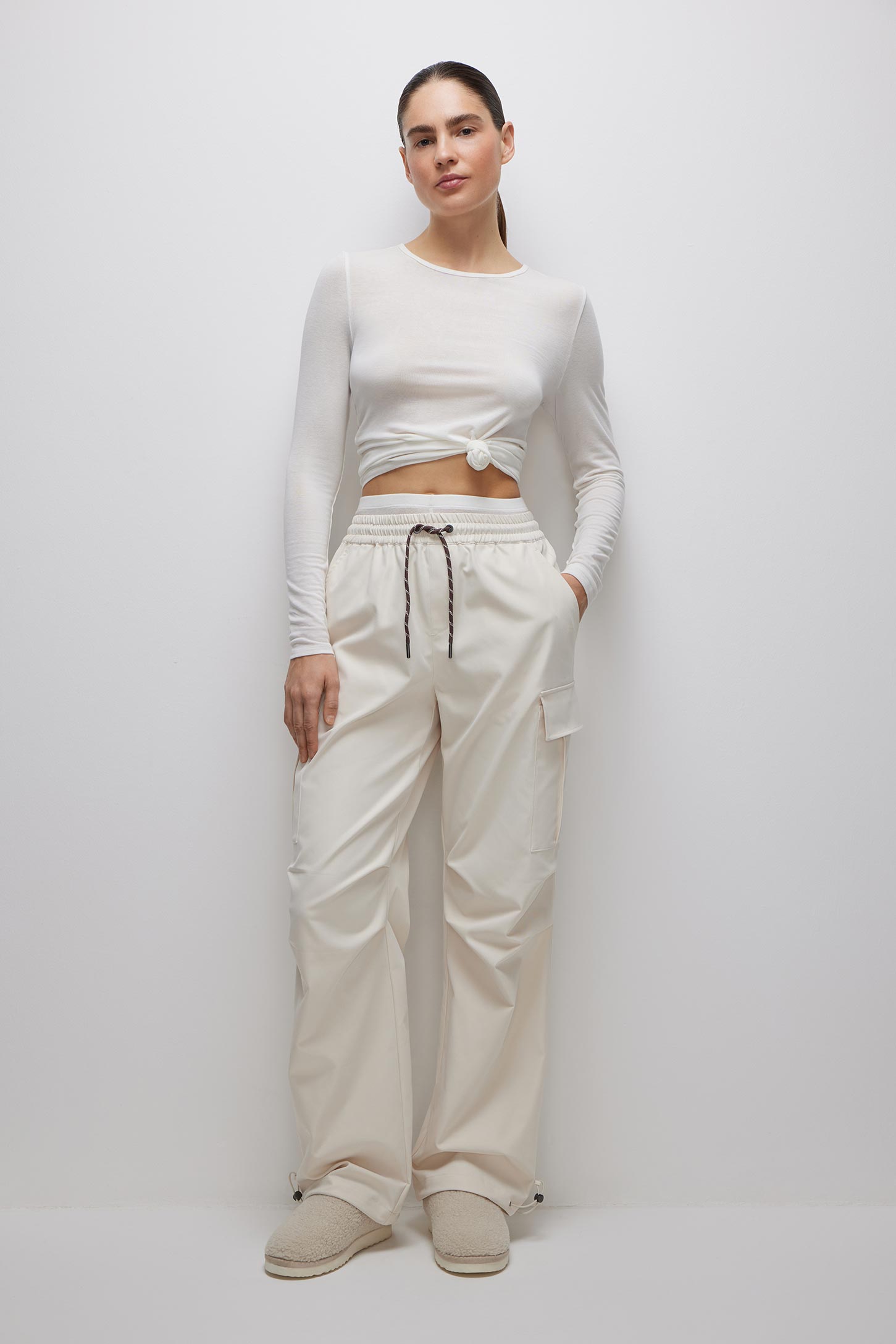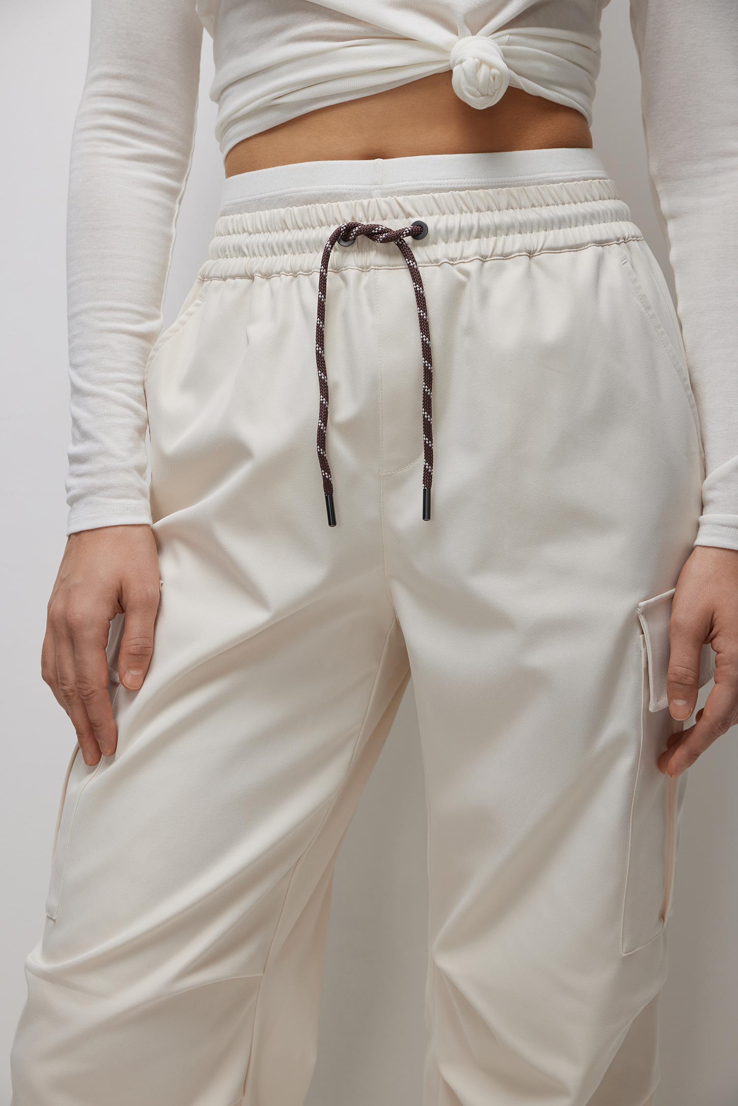 Брюки-карго с поясом на резинке из плотной ткани с саржевым переплетением отлично подходят для повседневных образов. Боковые прорезные карманы и накладные карманы с клапаном