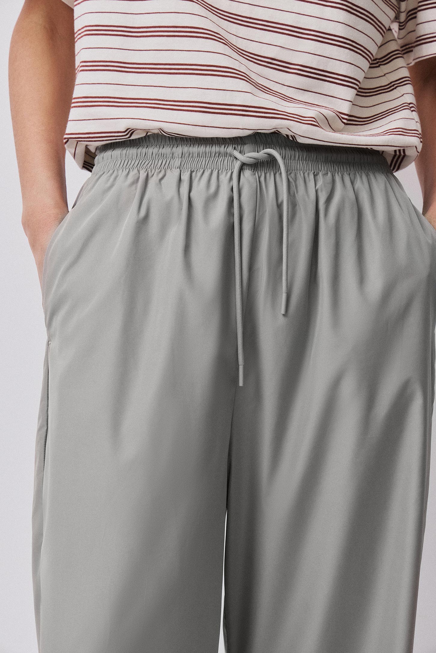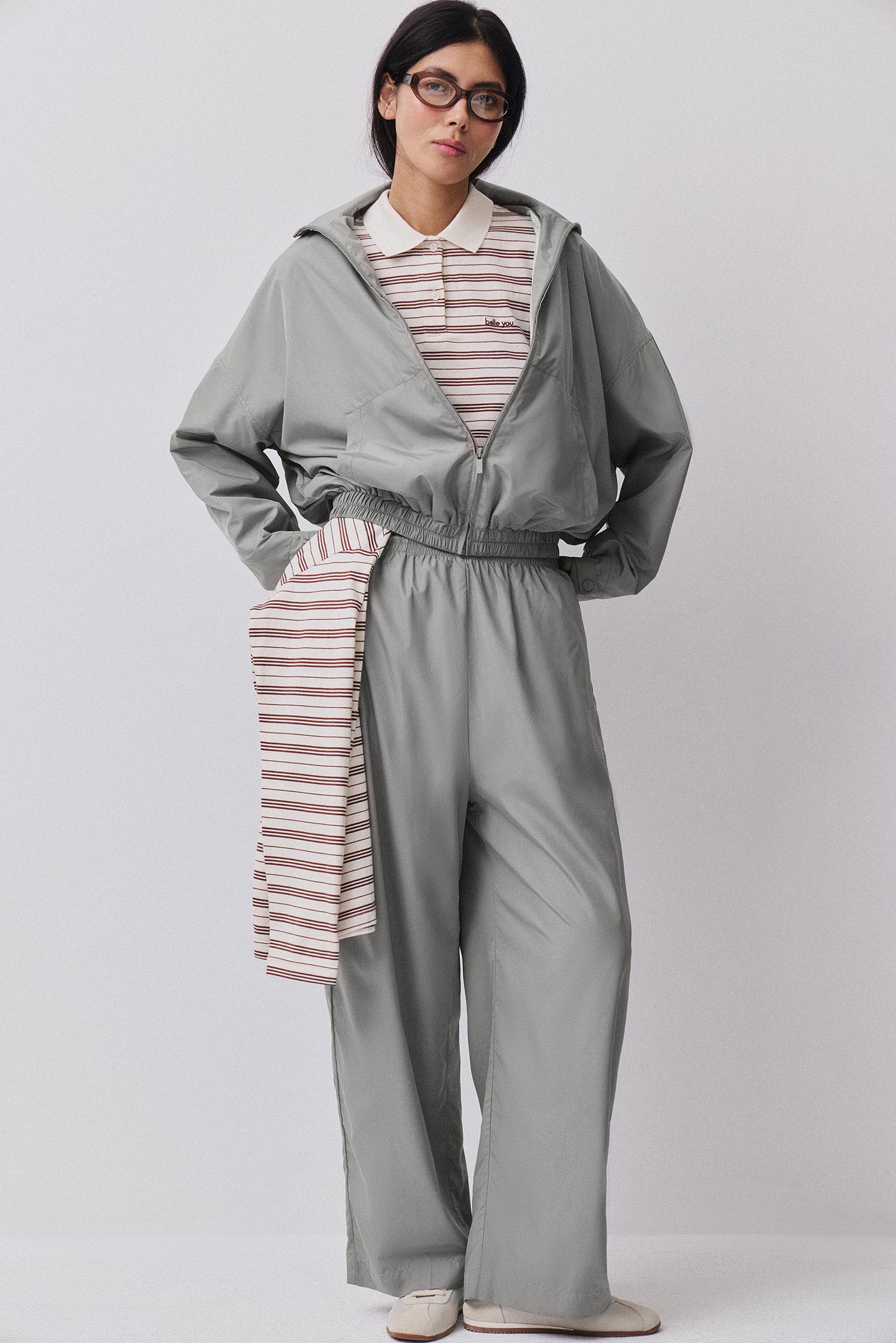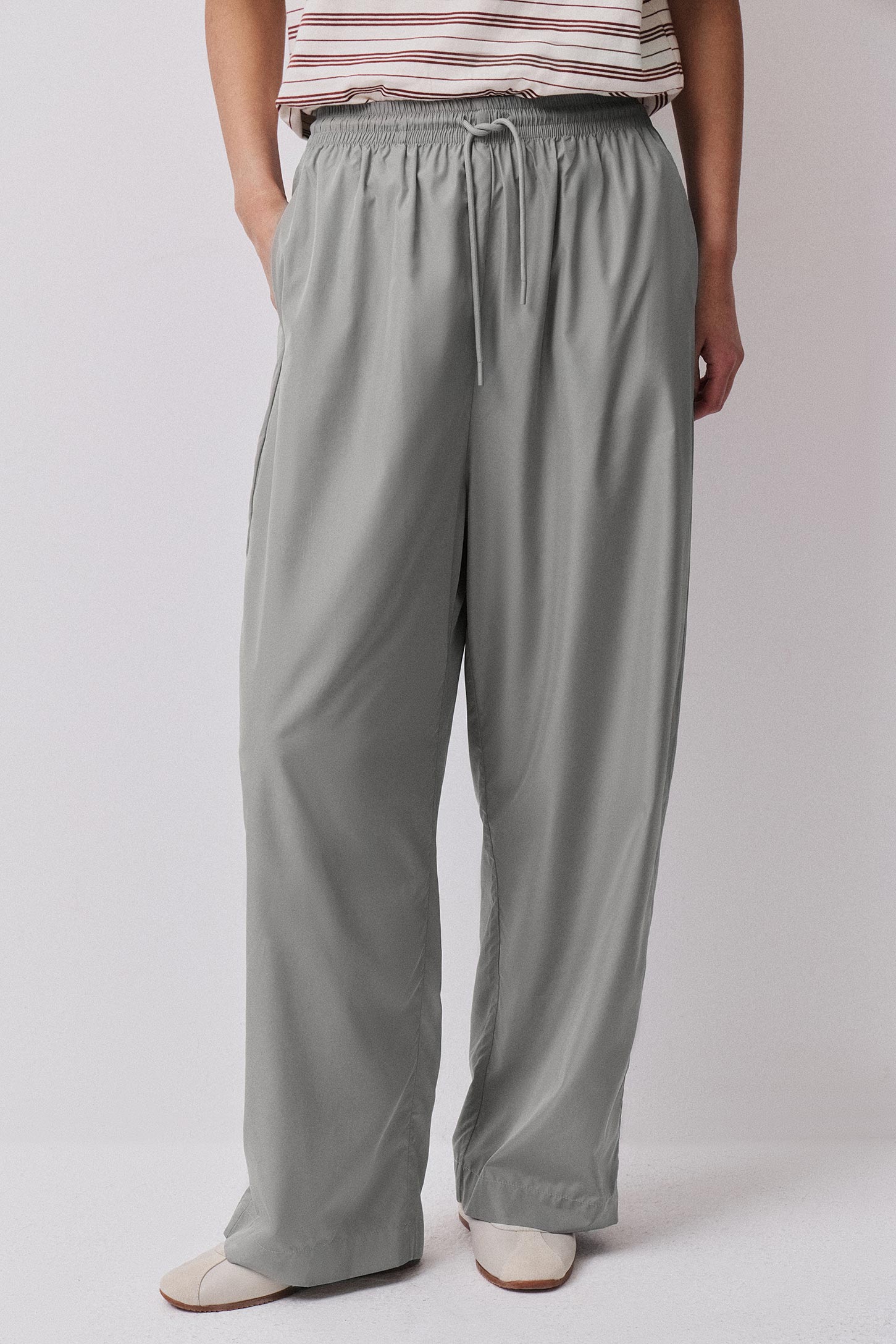 Брюки свободного силуэта из легкой плащевой ткани на широкой резинке с карманами в боковых швах. Швы с изнанки обработаны окантовкой из основной ткани, что придает изделию максимально завершенный и аккуратный вид. Декоративный шнур по поясу модели дает дополнительную фиксацию по талии и служит акцентом.