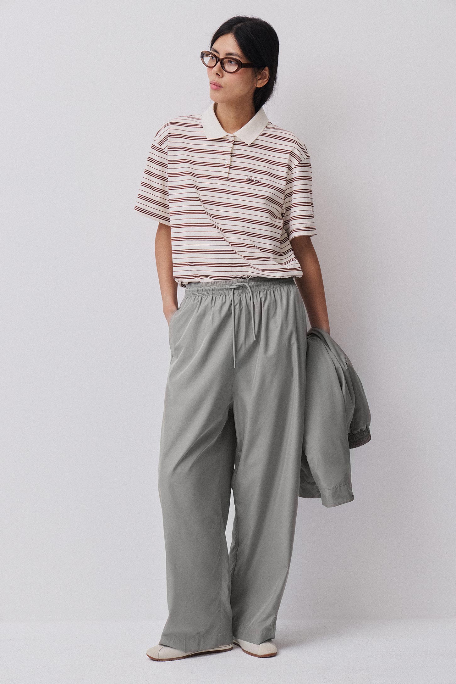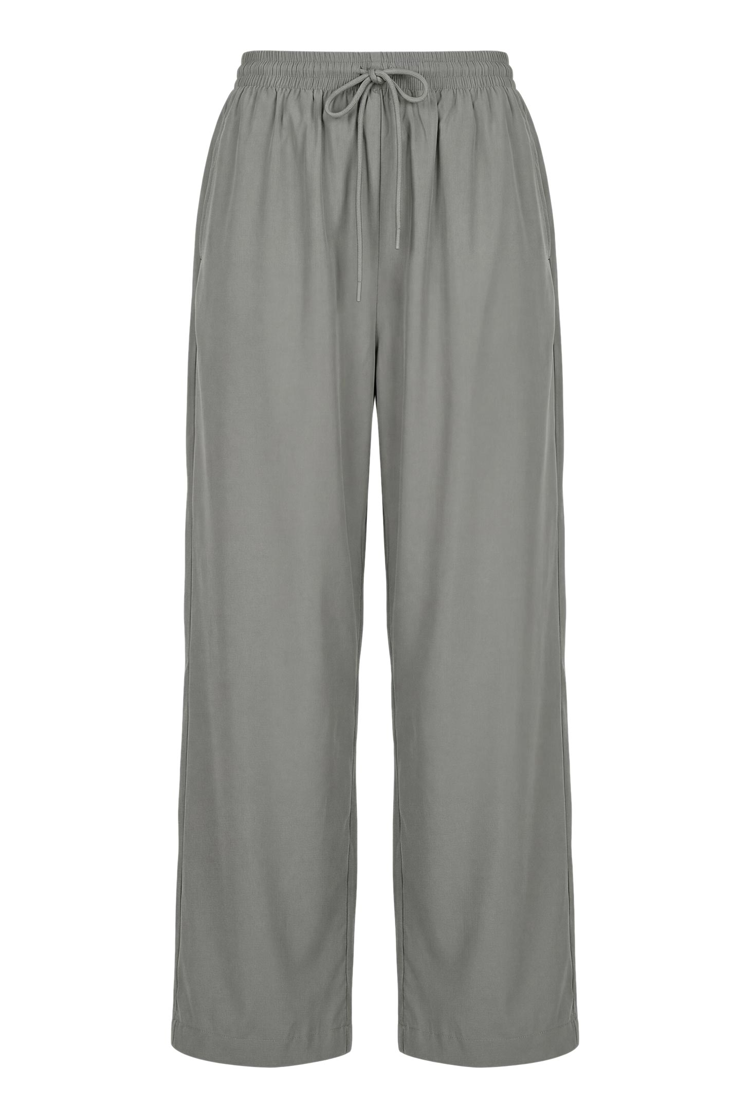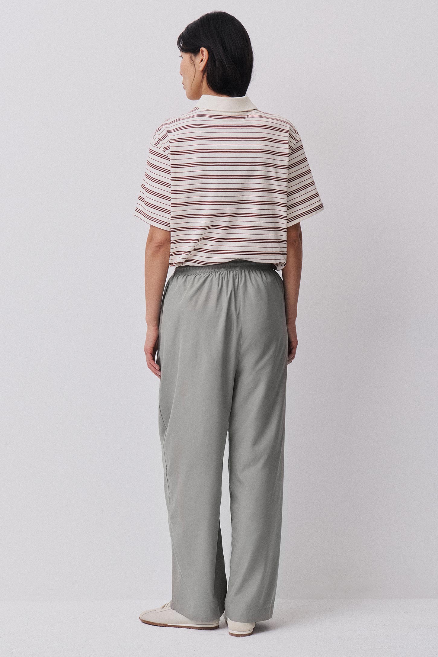 Брюки свободного силуэта из легкой плащевой ткани на широкой резинке с карманами в боковых швах. Швы с изнанки обработаны окантовкой из основной ткани, что придает изделию максимально завершенный и аккуратный вид. Декоративный шнур по поясу модели дает дополнительную фиксацию по талии и служит акцентом.