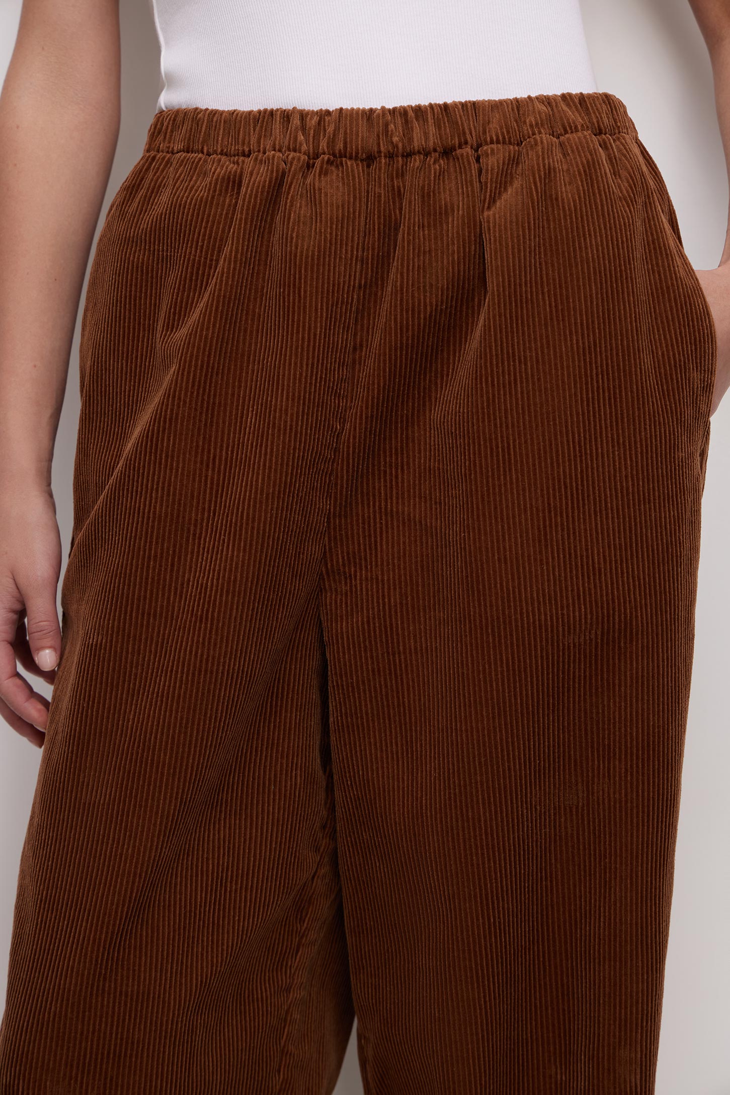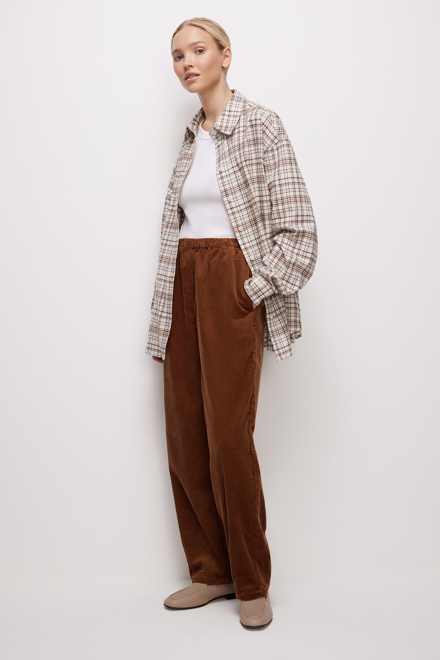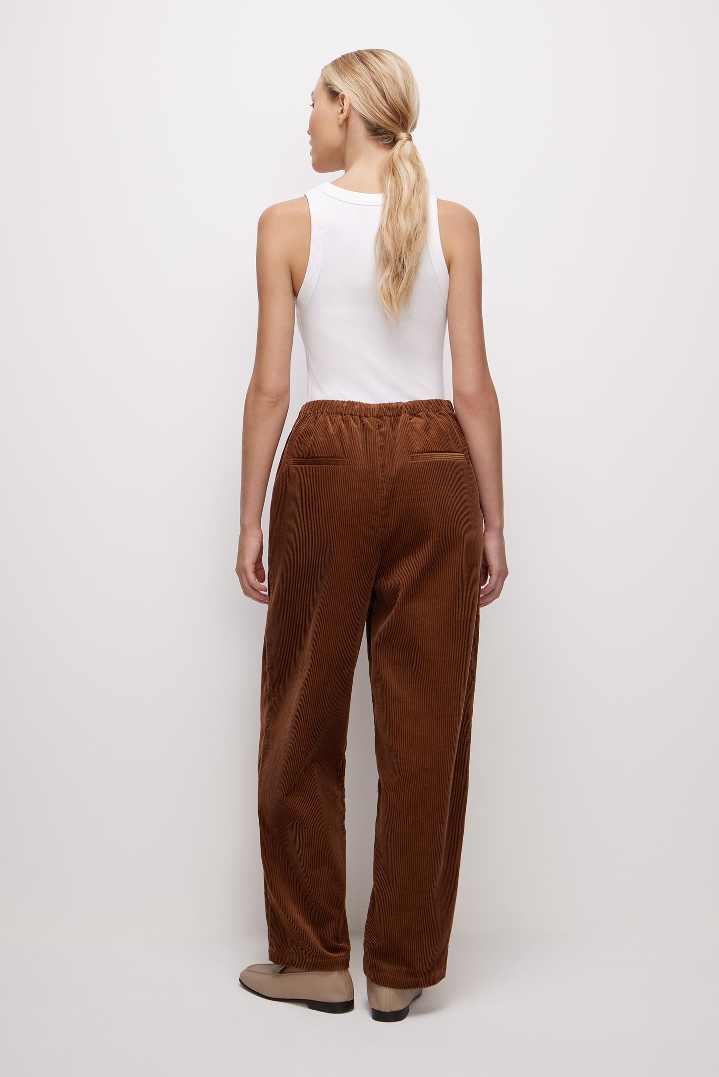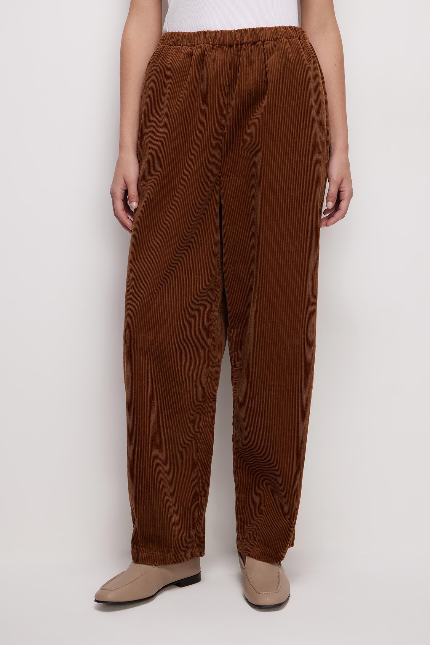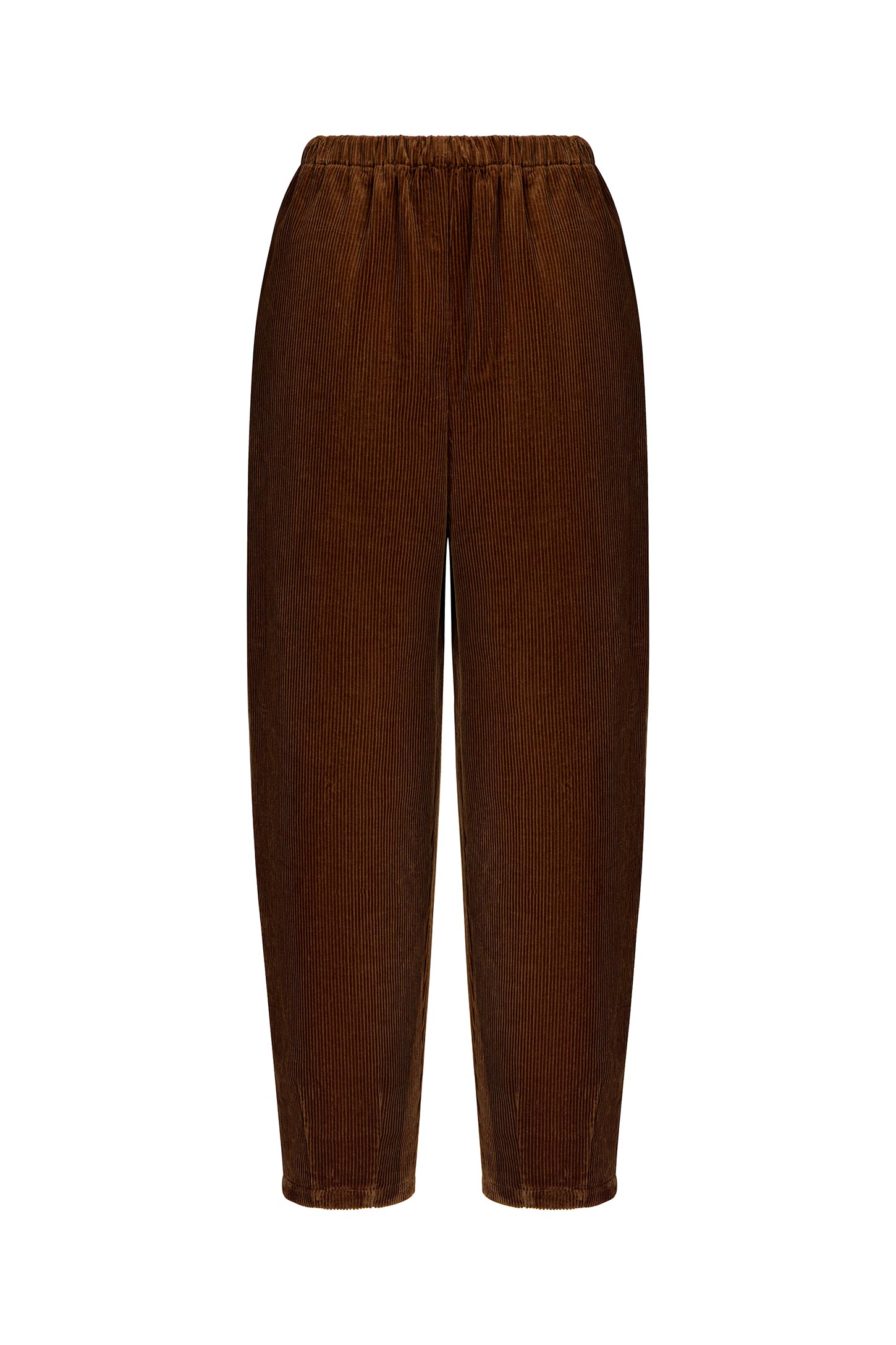 Брюки из мягкого вельвета на резинке по поясу, с прорезными карманами спереди в боковых швах и имитацией карманов с листочками на задней половинке изделия. Брюки трендового о-силуэта создают стильный образ; Комфортная посадка дает свободу движений.
