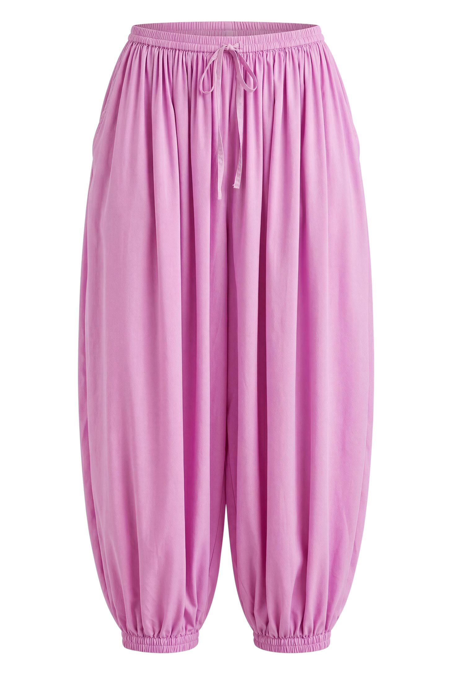 Объемные брюки из тонкой плащевки с карманами в боковых швах. Пояс на резинке, декоративный шнурок из основной ткани настрочен сверху. По низу брюки присобраны на резинку, что придает им силуэт «баллон». Модная модель бестселлер в дымчато-розовом и пыльно-розовом оттенках.