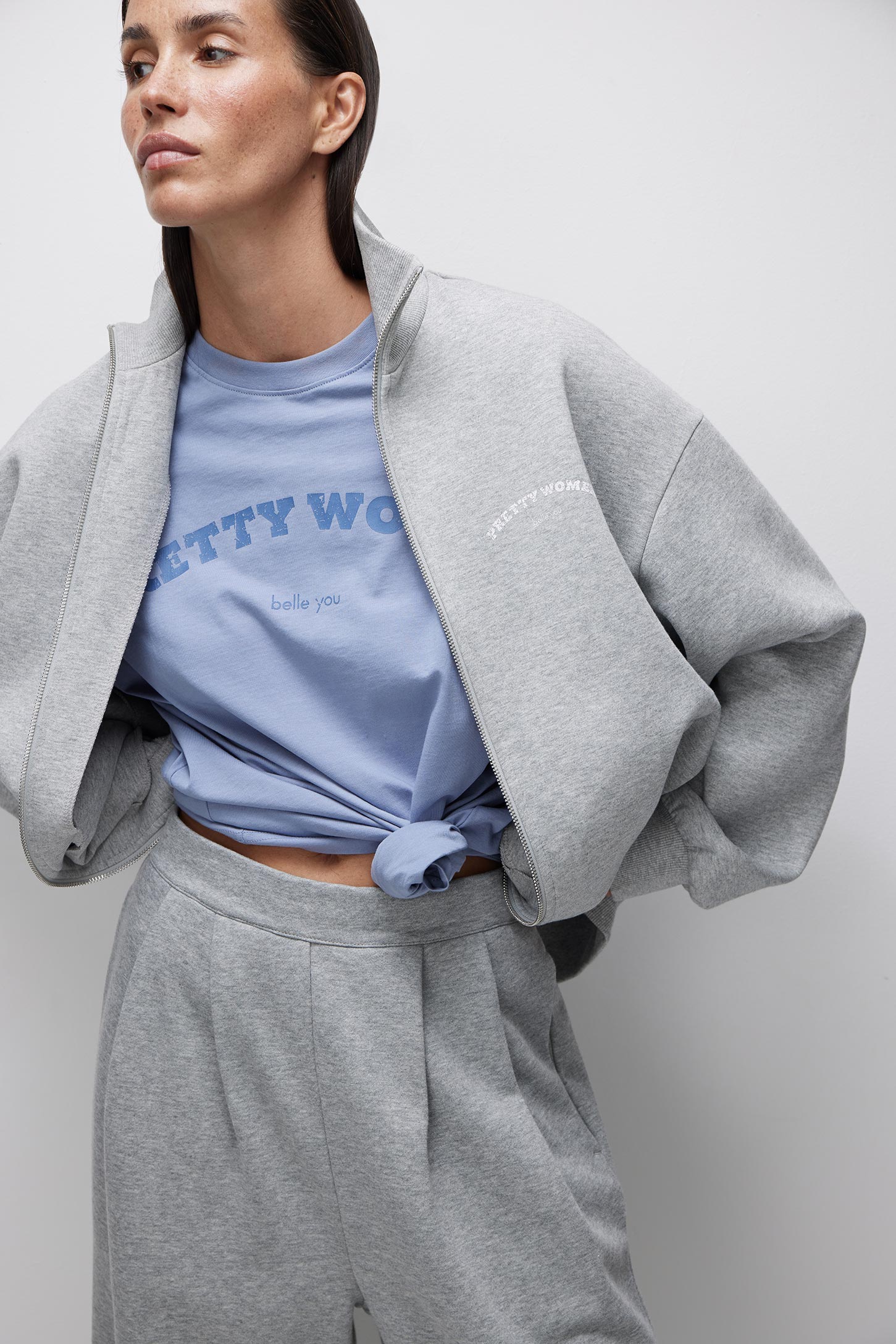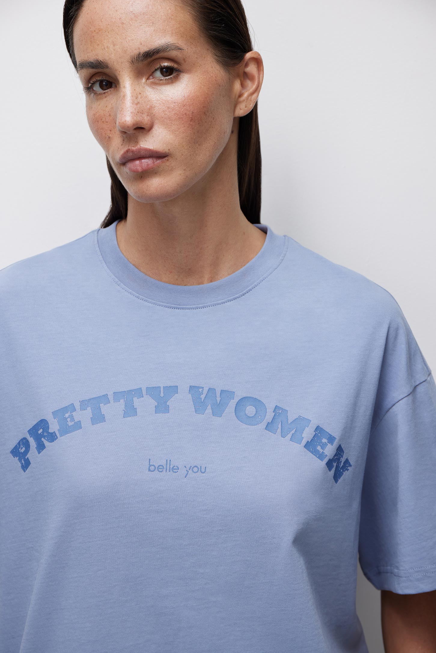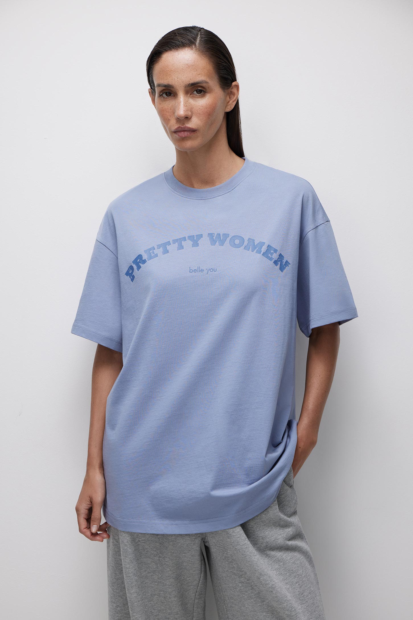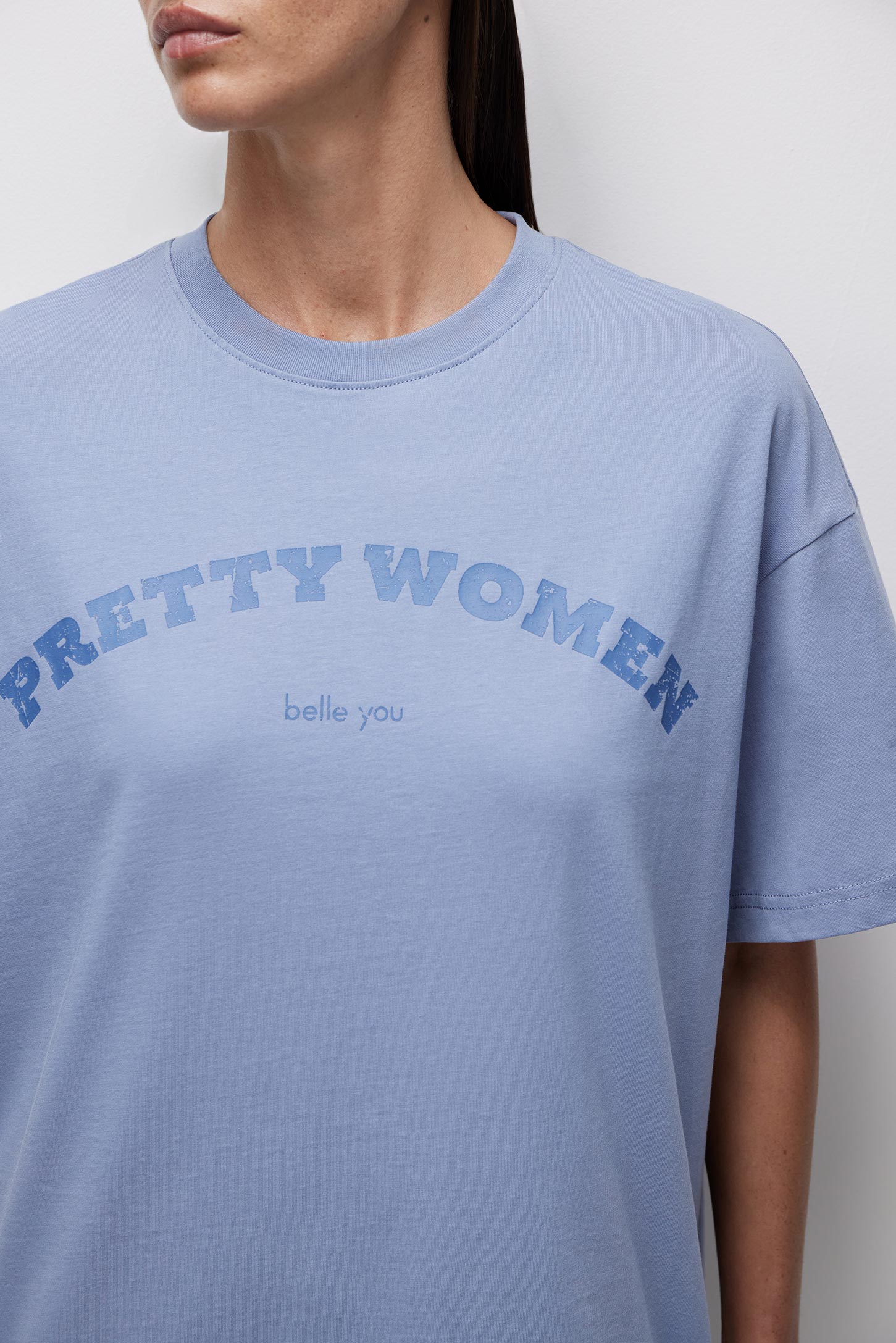 Объемная футболка изготовлена из гладкого трикотажа. Спущенное плечо, свободный рукав, объемный силуэт подарят чувство комфорта и свободы. Хлопковый трикотаж очень приятен к телу, позволяет коже дышать. Мягкая цветовая гамма, неконтрастный текстовый акцентный принт «PRETTYWOMEN» позволяет использовать футболку в качестве основы расслабленного повседневного образа.