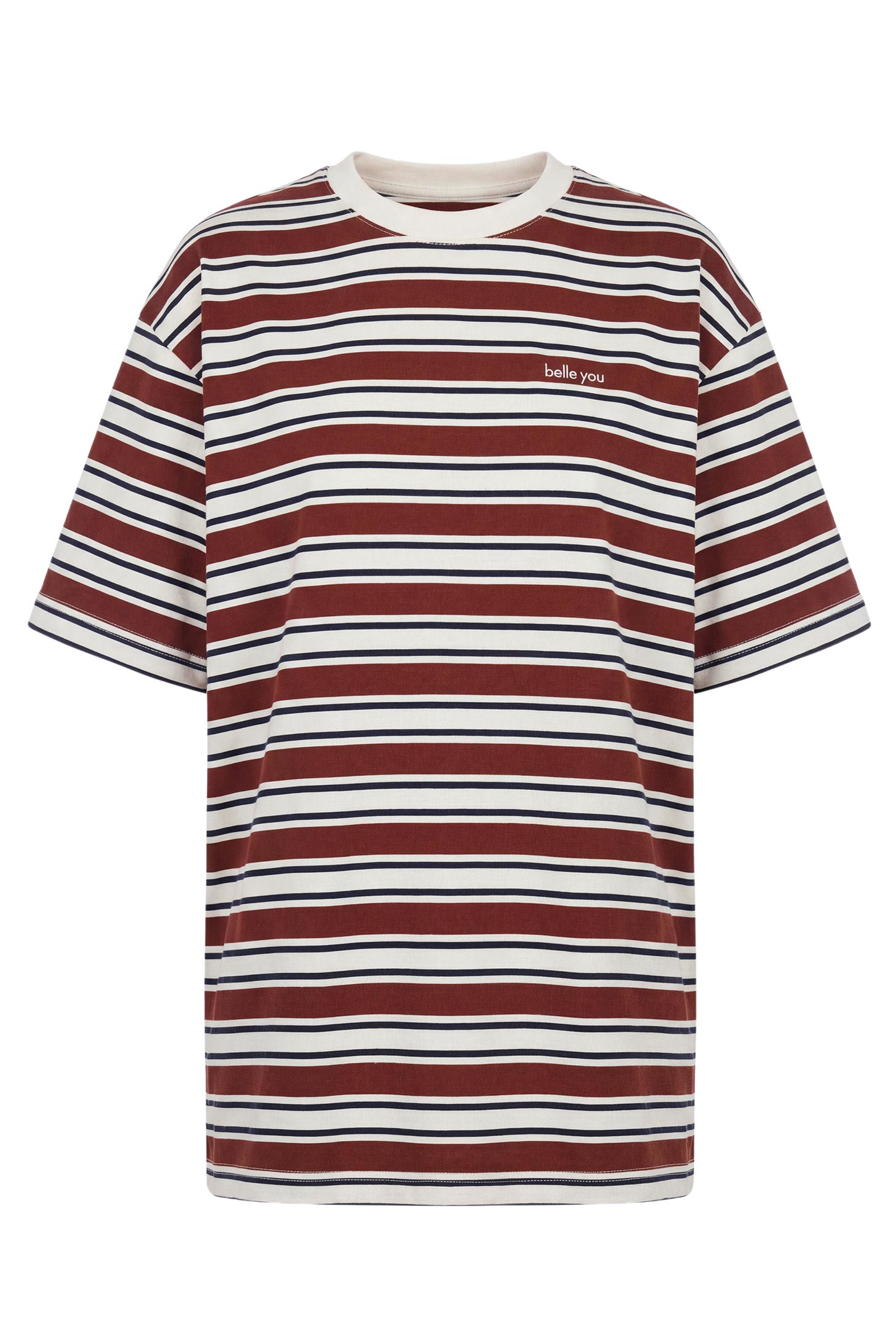 Футболка оверсайз силуэта из хлопка в полоску, горловина обработана однотонным рибом. Спущенная линия плеча, контрастная вышивка-лого спереди.