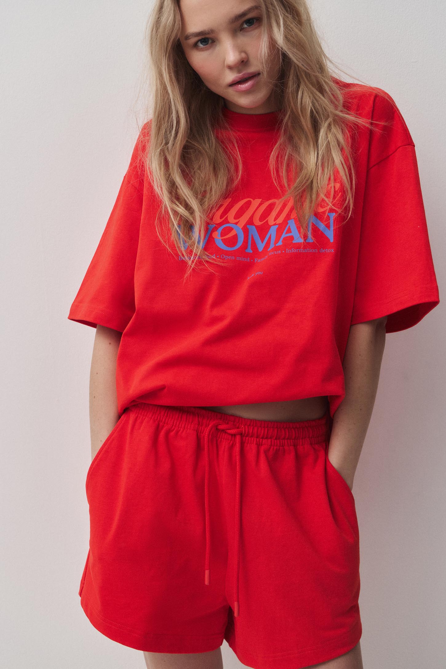Футболка силуэта оверсайз со спущенной линией плеча из хлопка с акцентным принтом спереди . Горловина обработана рибом.