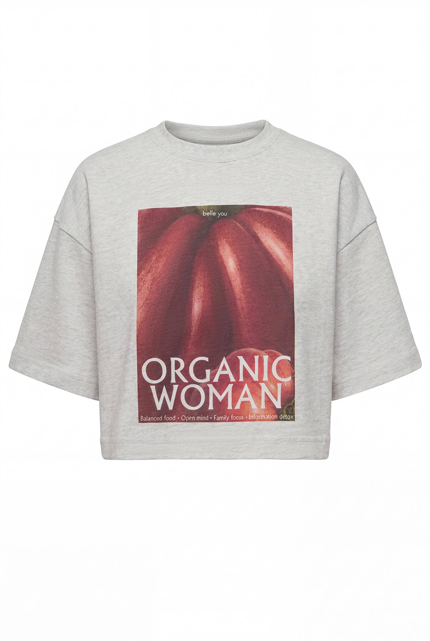 Укороченная футболка со спущенной линией плеча из хлопка с акцентным принтом спереди. Горловина обработана рибом. Рекомендуется дополнить футболку шортами W4160019 и брюками W4170037, выполненными в этой же ткани.