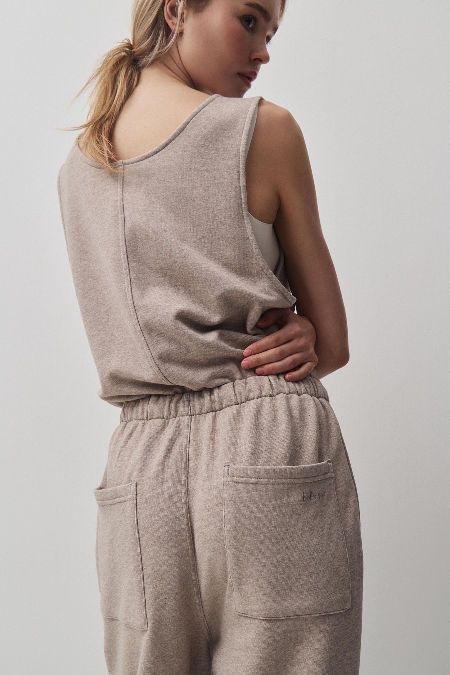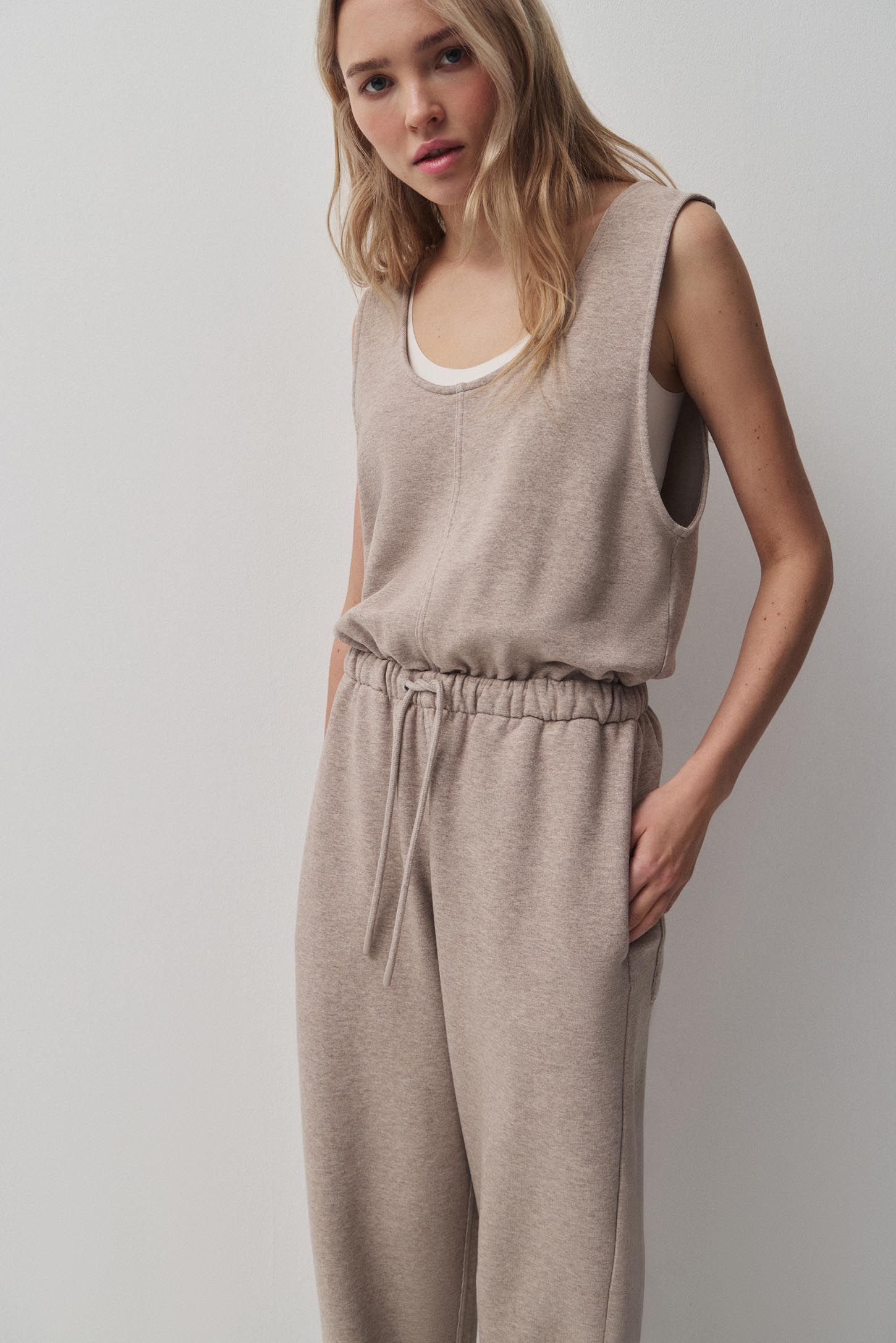 Расслабленный комбинезон из мягкого футера. Пояс-кулиcка со шнурком создает акцент на талии и позволяет регулировать прилегание. Модель дополнена прорезными карманами спереди и накладными карманами на задней детали. Вышивка на заднем кармане в тон изделия дополняет лаконичную модель.