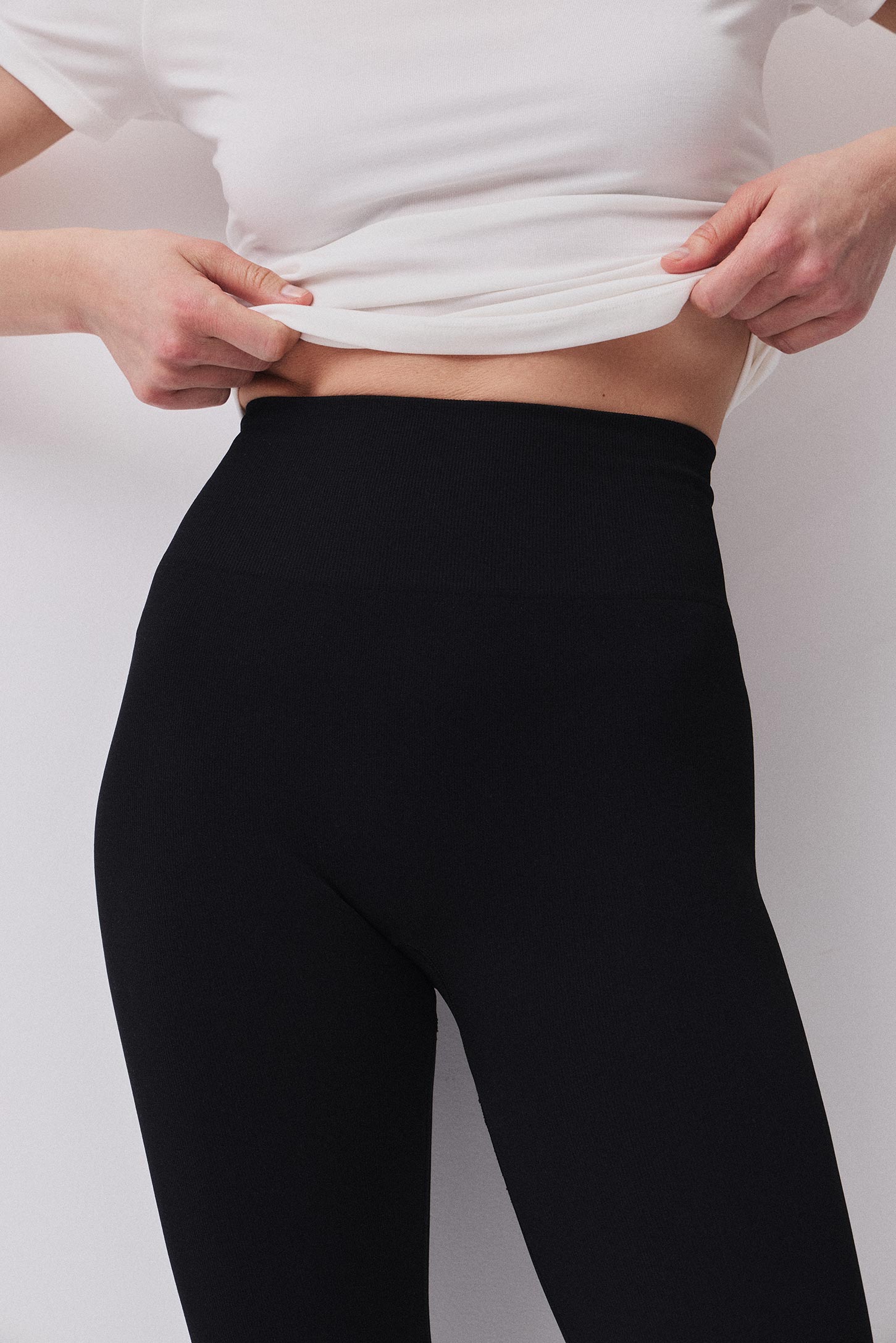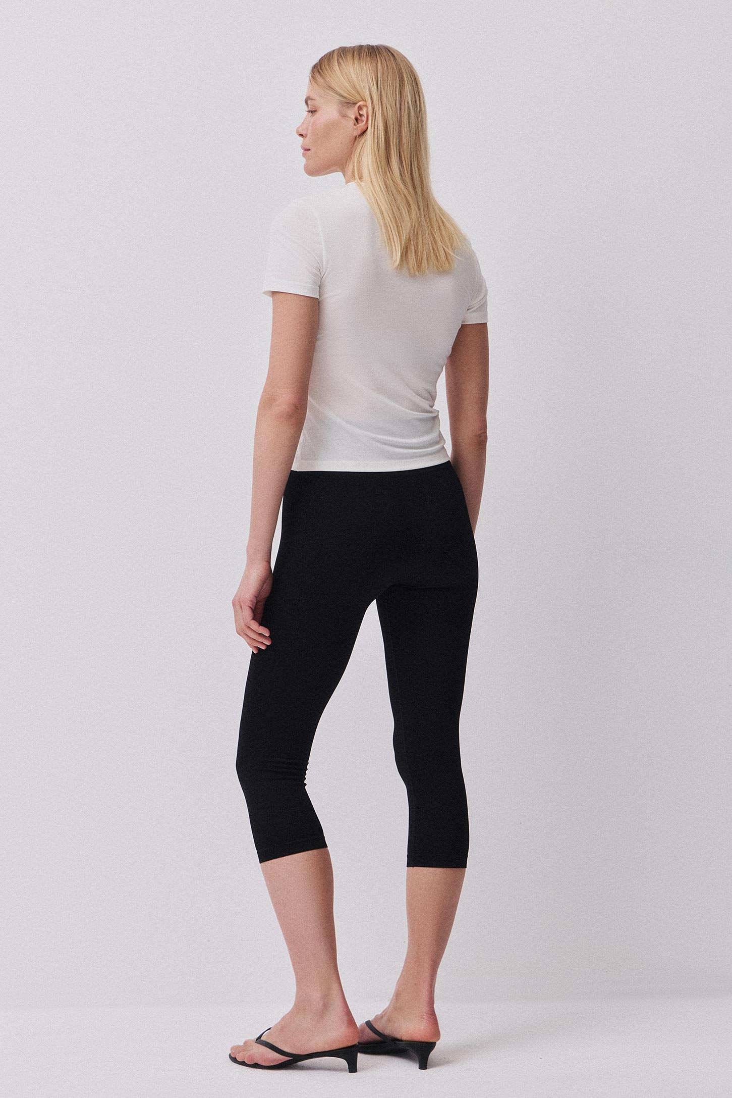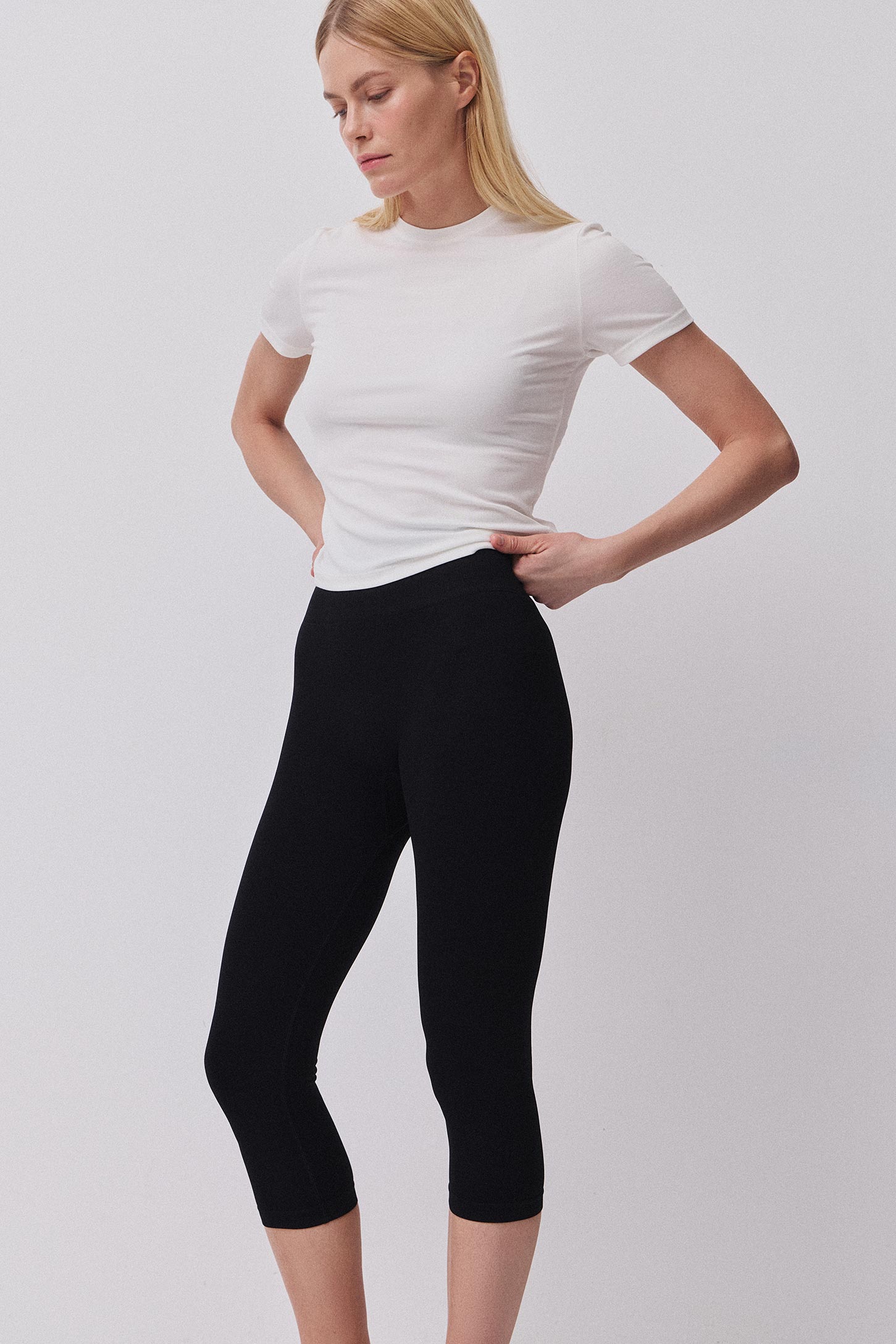 Легинсы-капри с высокой посадкой из гладкой эластичной микрофибры. Изделие изготовлено по современной технологии seamless без боковых швов. Широкий пояс подчеркивает талию. Легинсы дополнены вставкой-ластовицей для удобства