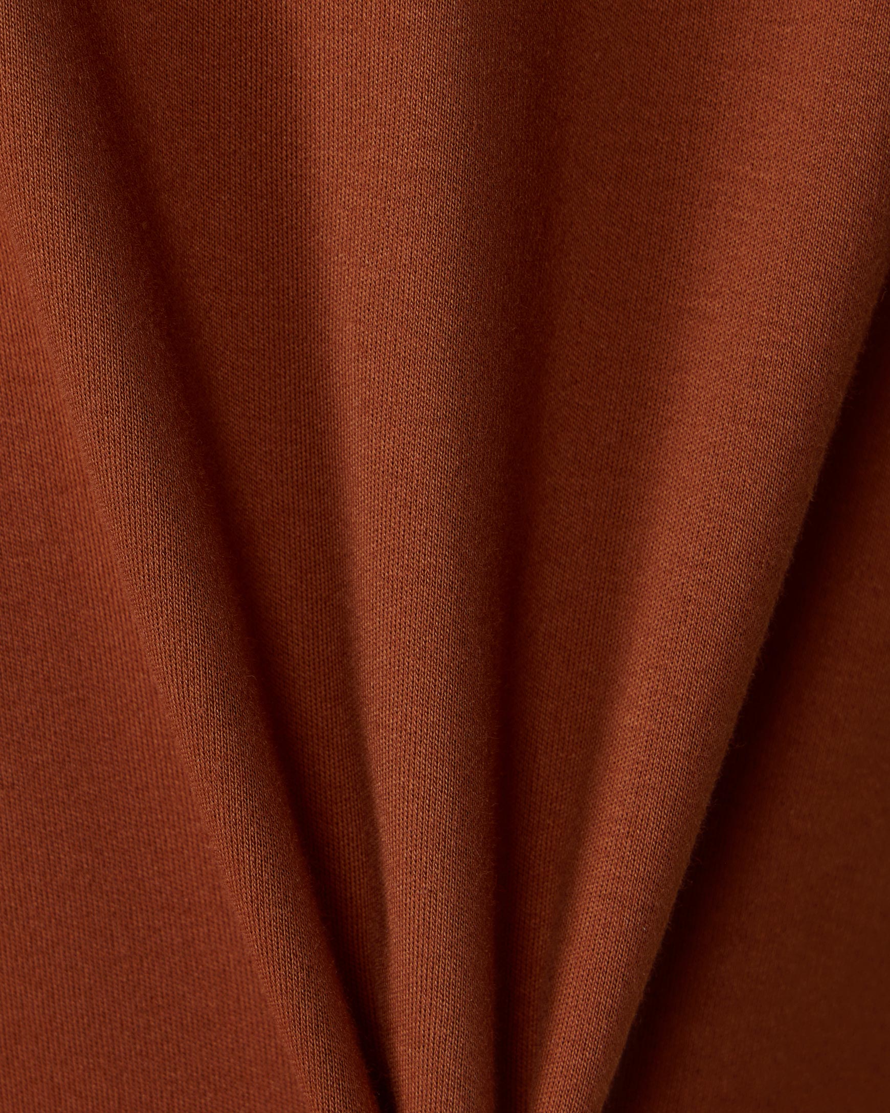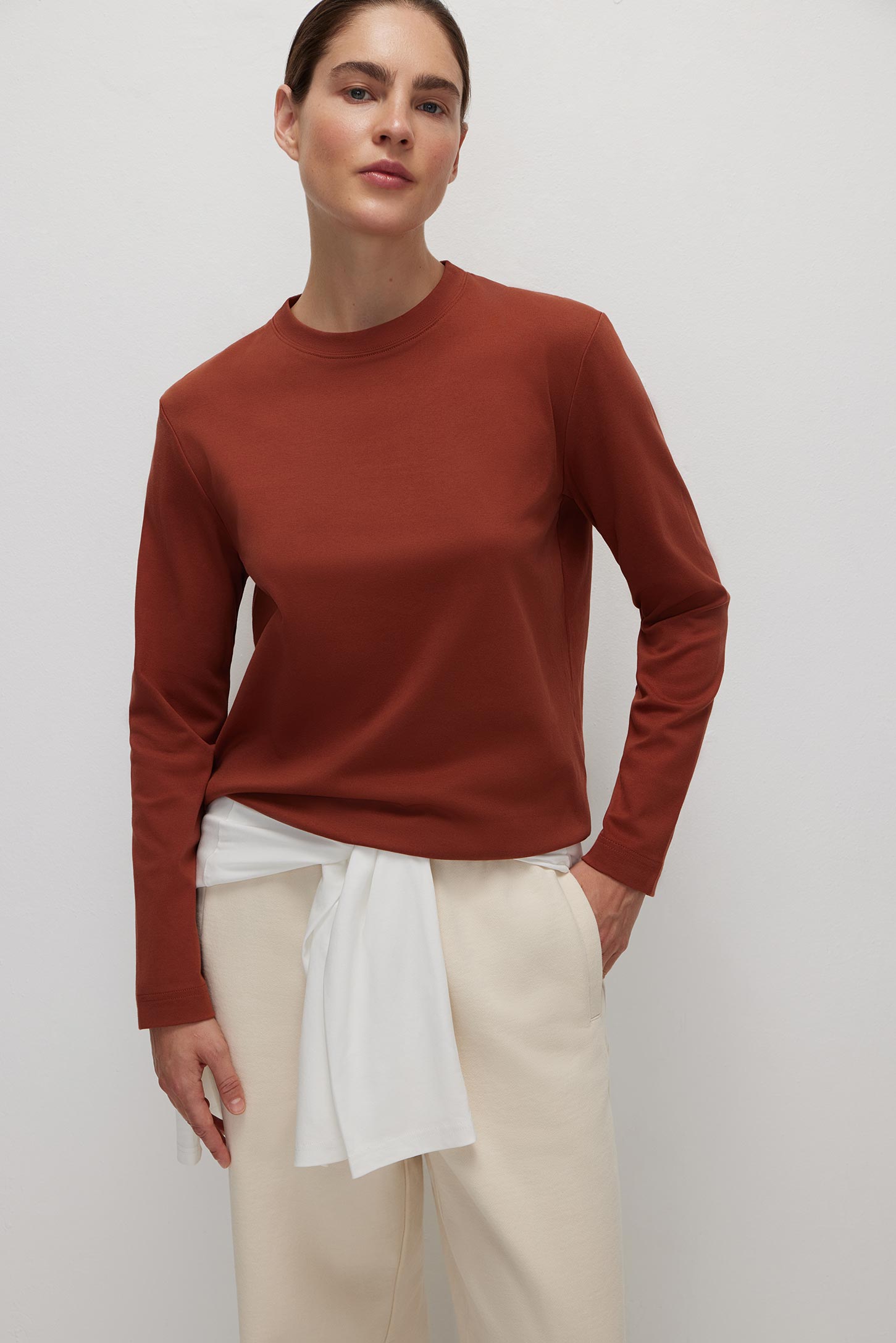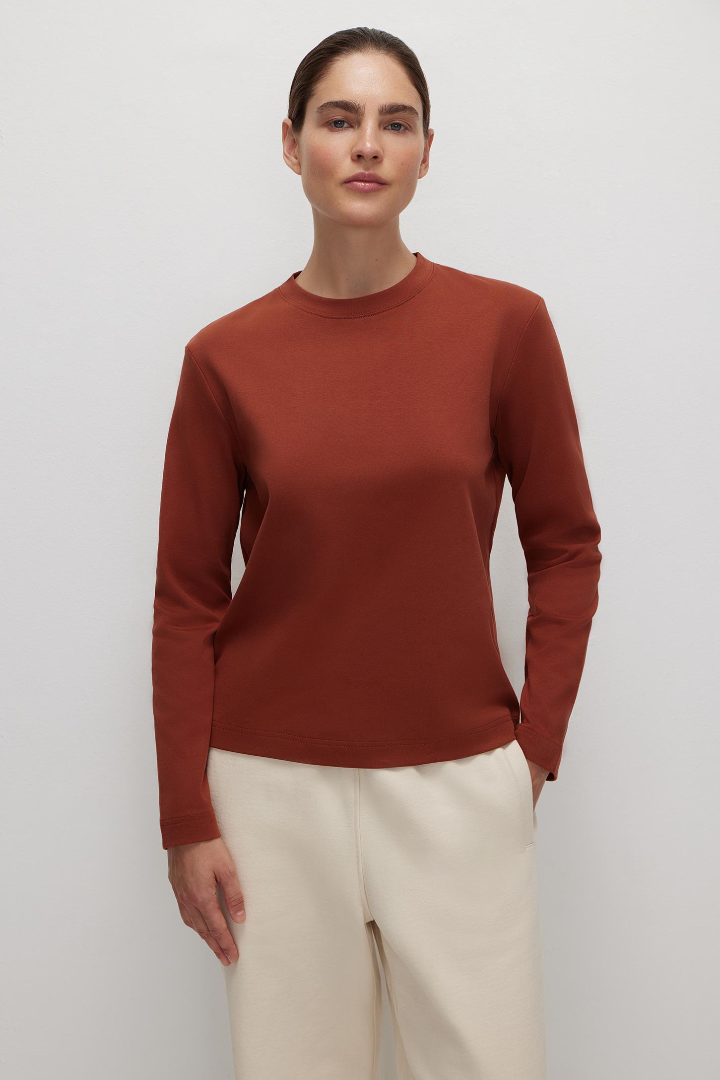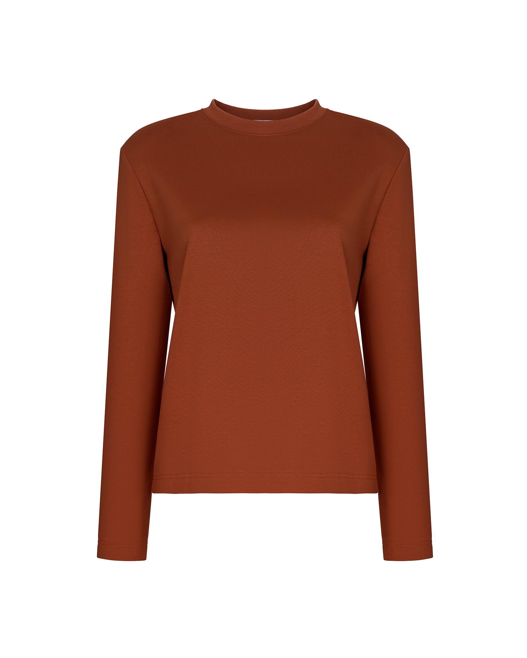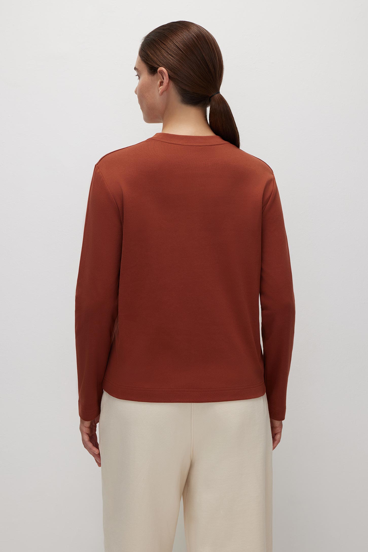 Лонгслив свободного силуэта из плотного интерлока в терракотовом цвете станет ярким акцентом в вашем образе. Горловина окантована рибом в цвет основной ткани.