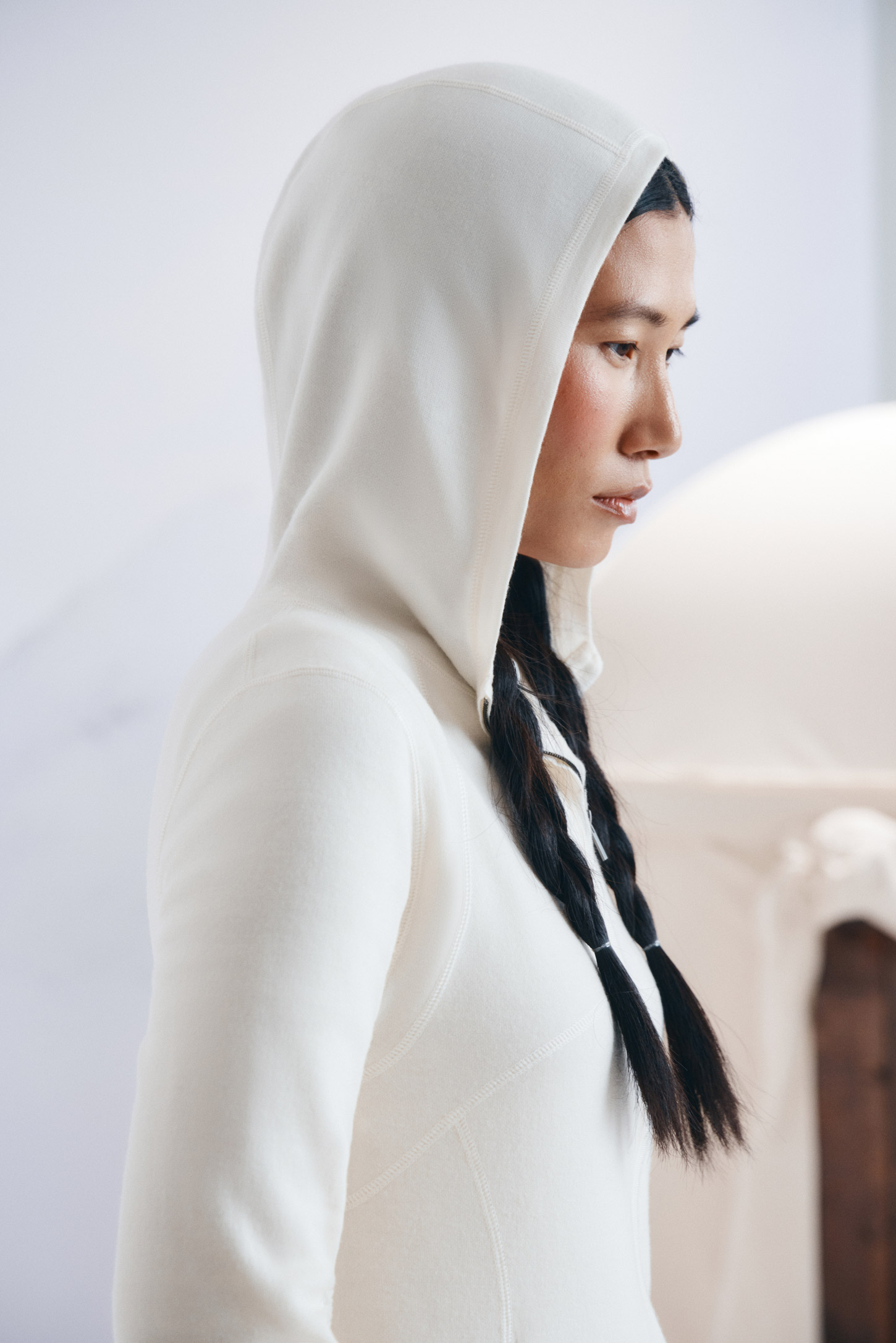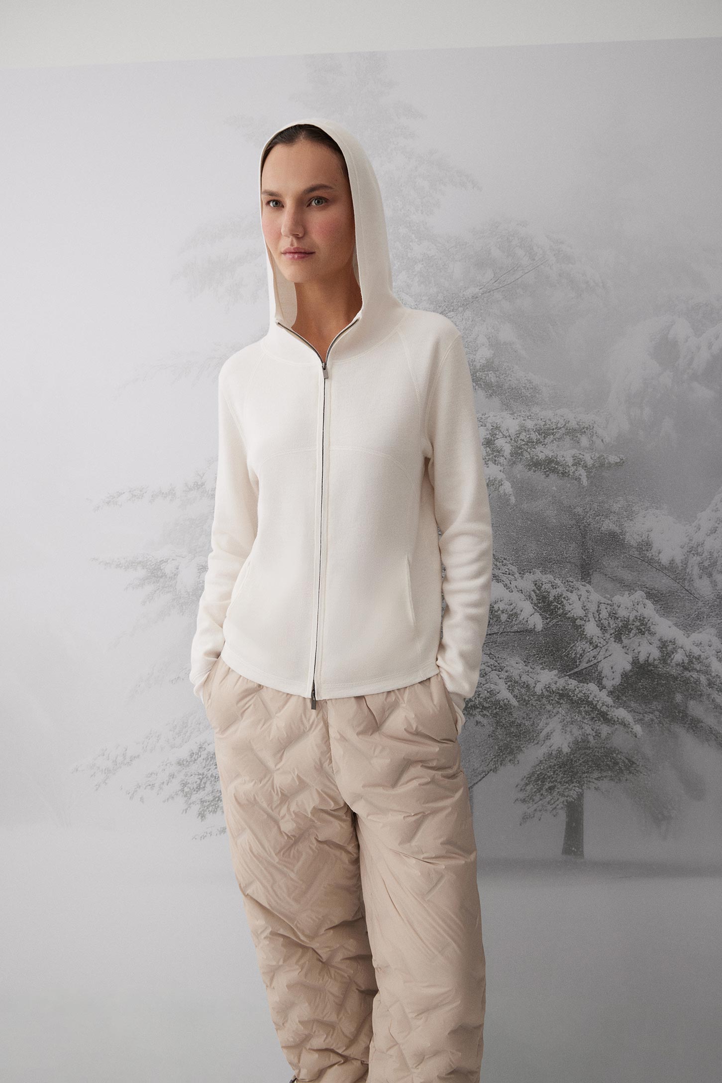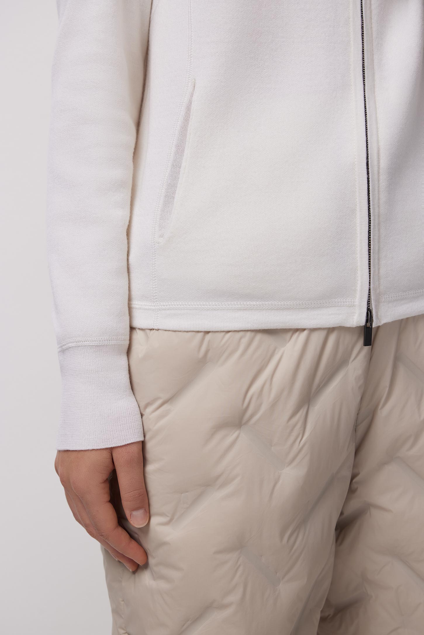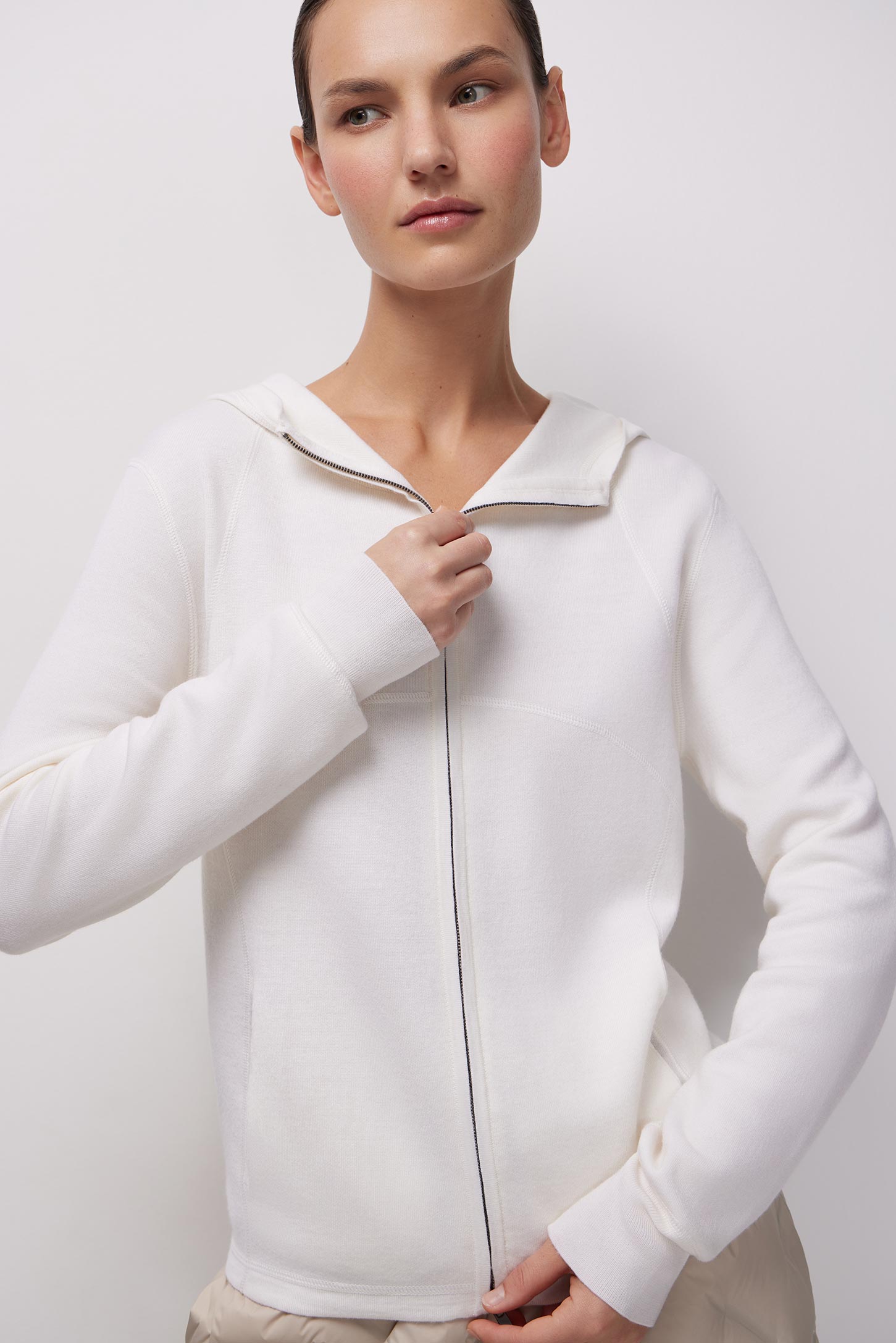 Вязаный лонгслив полуприлегающего силуэта с застежкой-молнией. По низу рукавов трикотажные манжеты в рубчик. Изделие с капюшоном и прорезными карманами в рельефных швах, которые делают лонгслив более функциональным. Лонгслив выполнен из пряжи тонкой вязки класса 16 gauge, которая помимо хорошо согревающих свойств, делает структуру материала тонкой, благодаря чему изделие получается более легким и комфортным в носке.