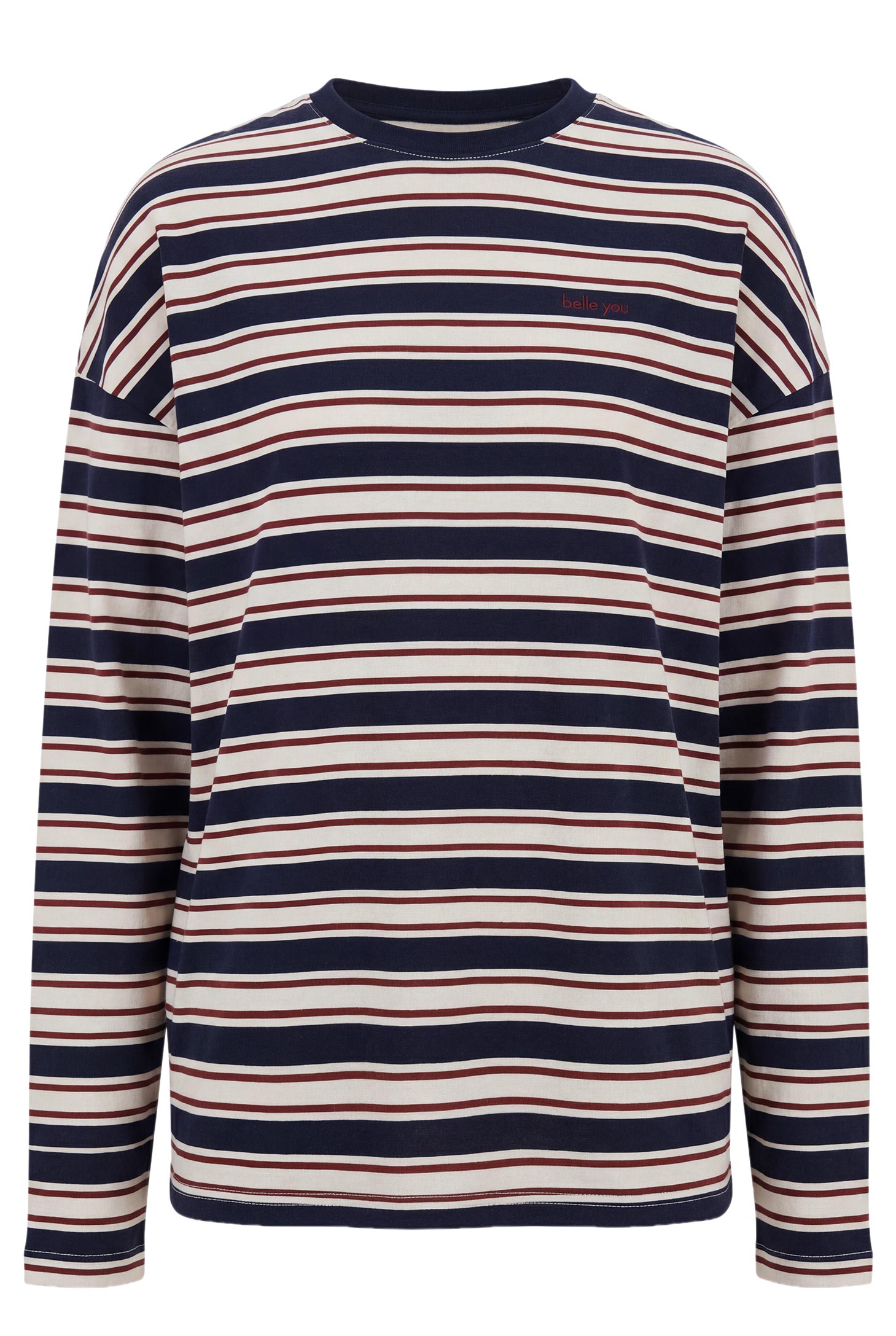 Лонгслив оверсайз силуэта из хлопка в полоску, горловина обработана однотонным рибом. Спущенная линия плеча, контрастная вышивка-лого спереди.