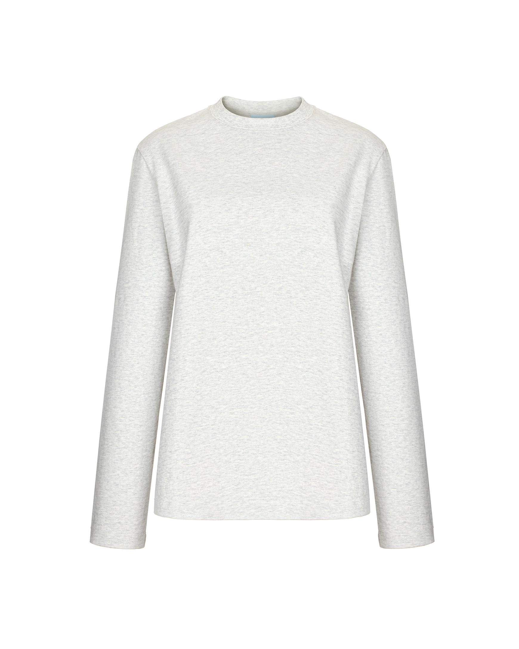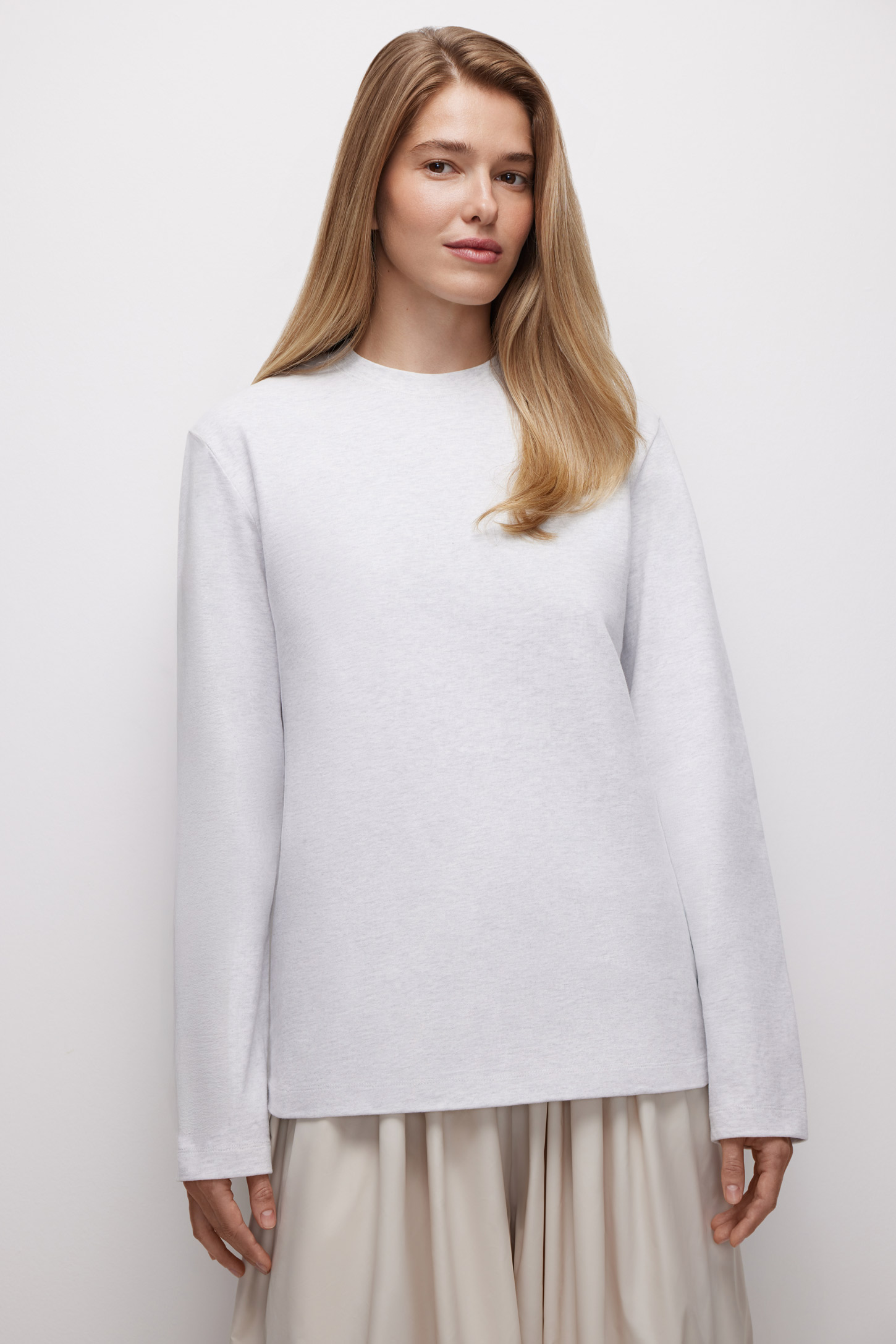 Лонгслив свободного силуэта изготовлен из плотного хлопка с peach-эффектом. Горловина обработана рибом. Свободный силуэт, спущенная линия плеча, тактильно приятный материал дарят чувство комфорта и свободы. Лаконичная форма изделия и светло-серый цвет меланжа позволяет с легкостью вписать его в любой гардероб.