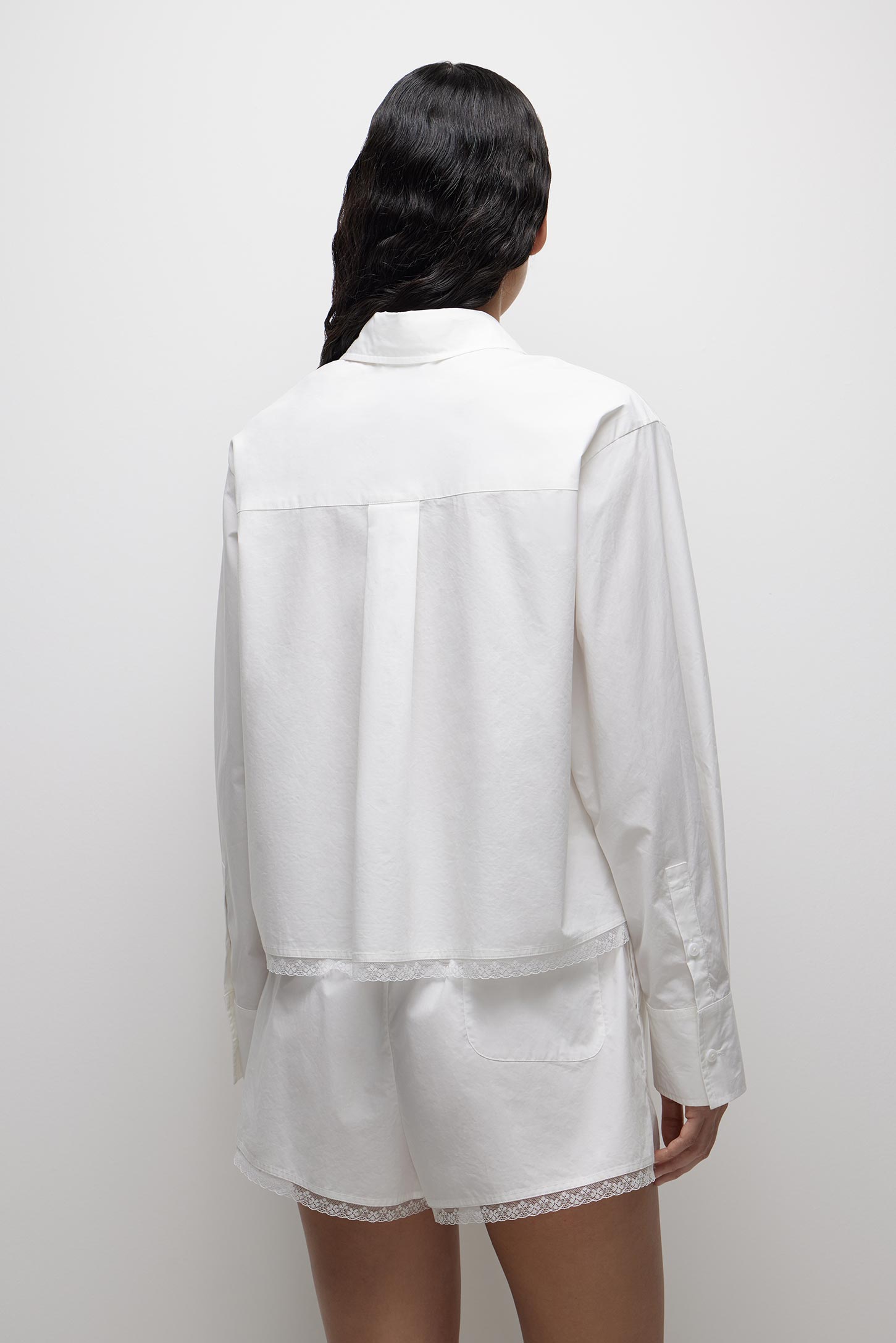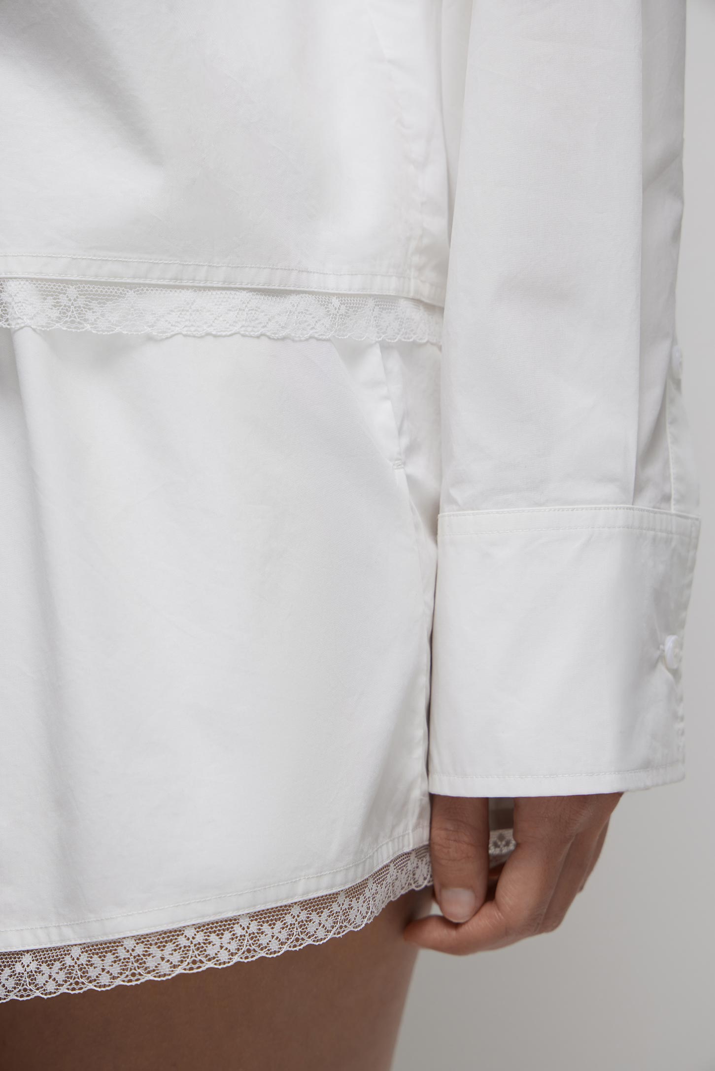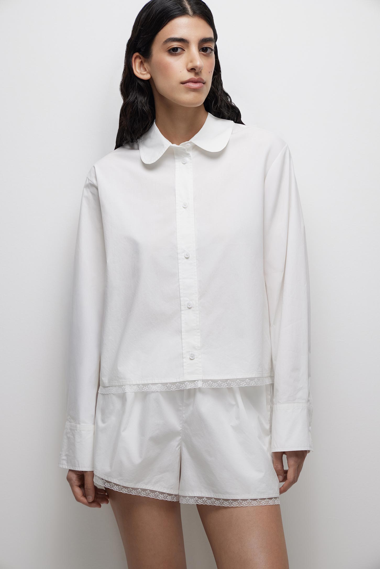 Укороченная пижамная рубашка из тонкой мягкой хлопковой ткани с закругленным воротником на стойке и декором из тонкого кружева по низу изделия. Модель представлена со спущенным плечом, рукава со складкой у манжеты. Рубашка