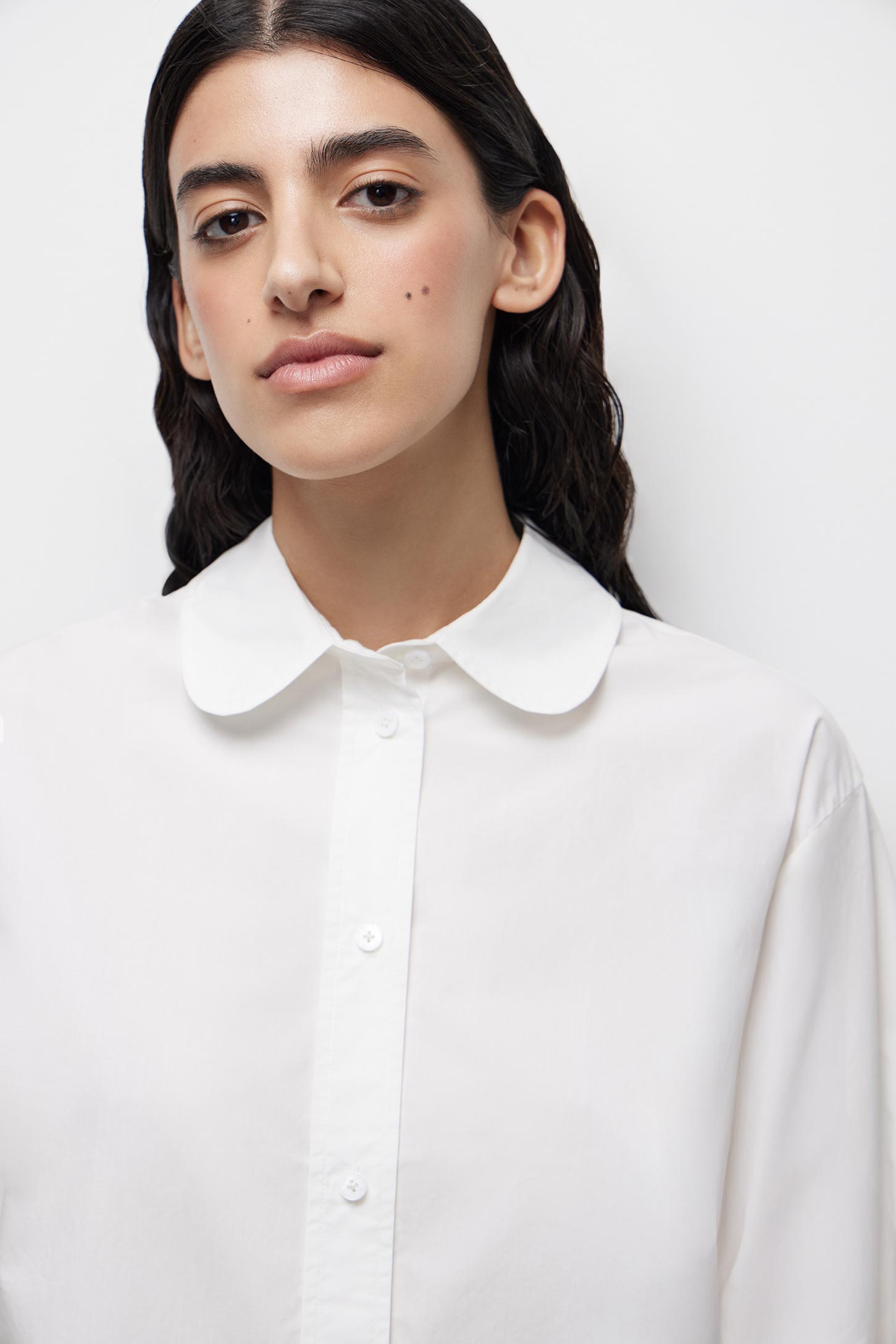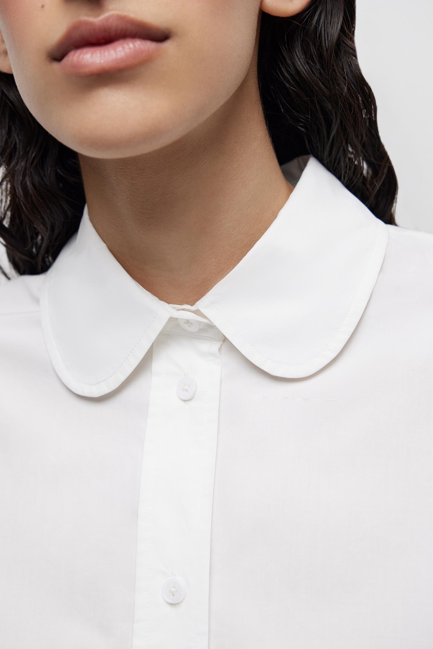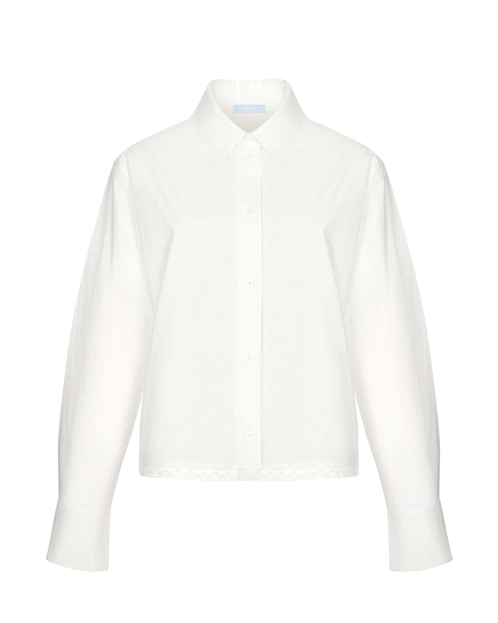 Укороченная пижамная рубашка из тонкой мягкой хлопковой ткани с закругленным воротником на стойке и декором из тонкого кружева по низу изделия. Модель представлена со спущенным плечом, рукава со складкой у манжеты. Рубашка