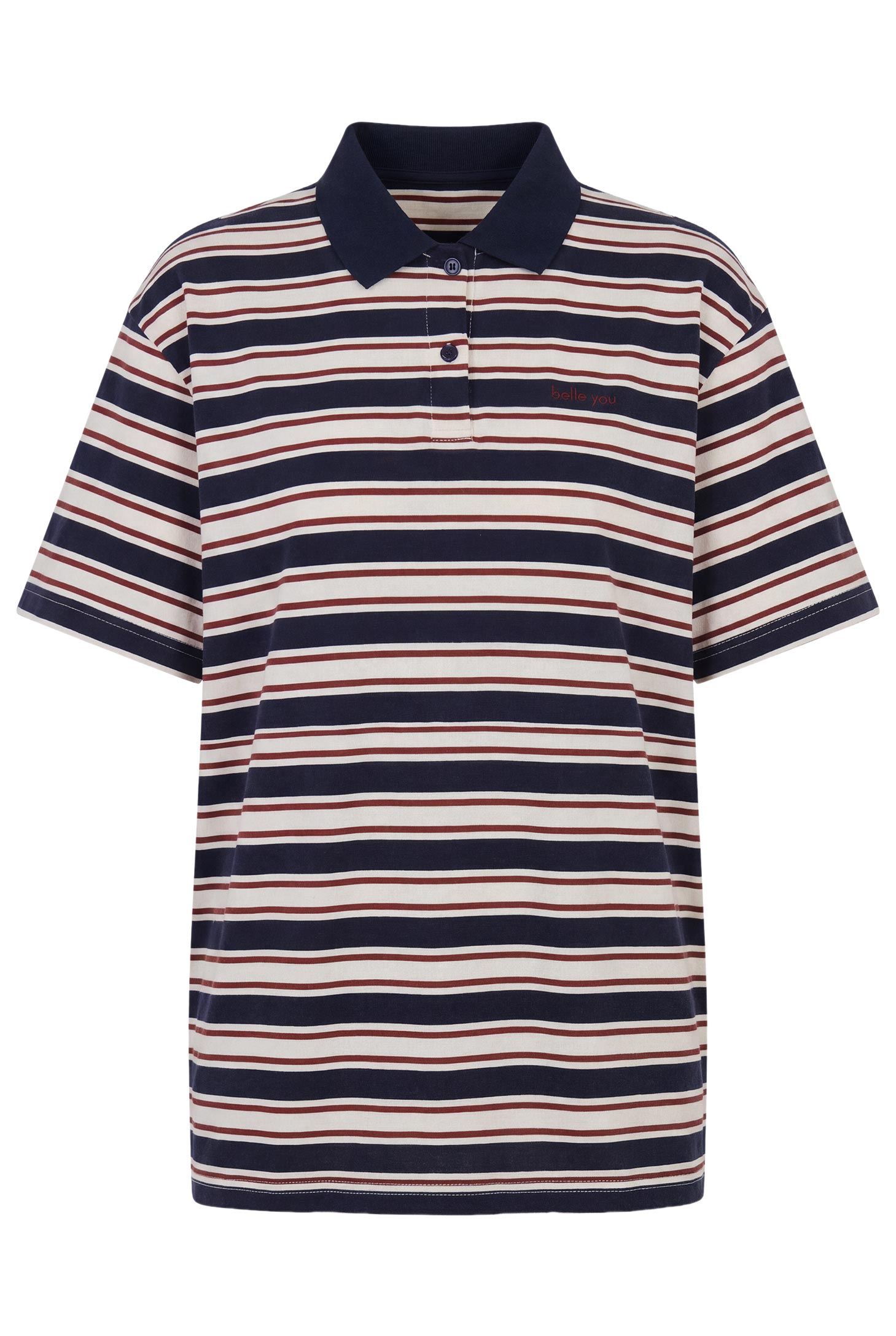 Футболка - поло свободного силуэта из хлопка в полоску. Спущенная линия плеча, цельнокроеная планка из основной ткани с застежкой на 3 пуговицы. Контрастная вышивка-лого спереди.