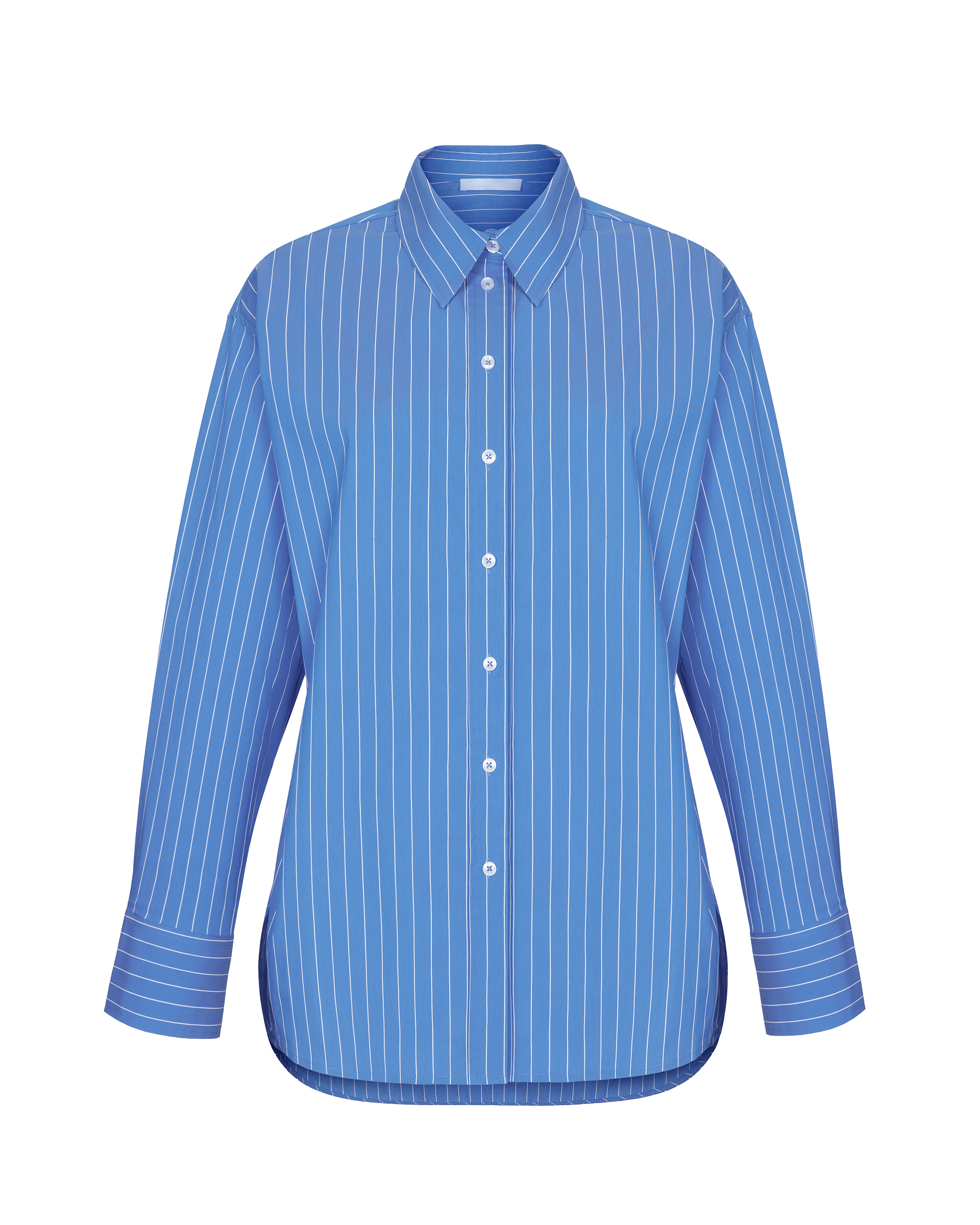 Объемная рубашка в полоску изготовлена из хлопкового поплина сконструирована по принципу мужской сорочки: классический воротник на стойке, планка с пуговицами, широкие манжеты, округлый низ изделия. Свободный удлиненный силуэт и спущенный рукав подарят невероятное ощущение комфорта. Элементы мужской сорочки подчеркнут хрупкость и женственность. Благодаря добавлению синтетических волокон в состав ткани изделие практически не мнется. Сочетайте рубашку с брюками и шортами из поплина. Такие комплекты идеально подойдут для создания расслабленных домашних и повседневных городских образов.