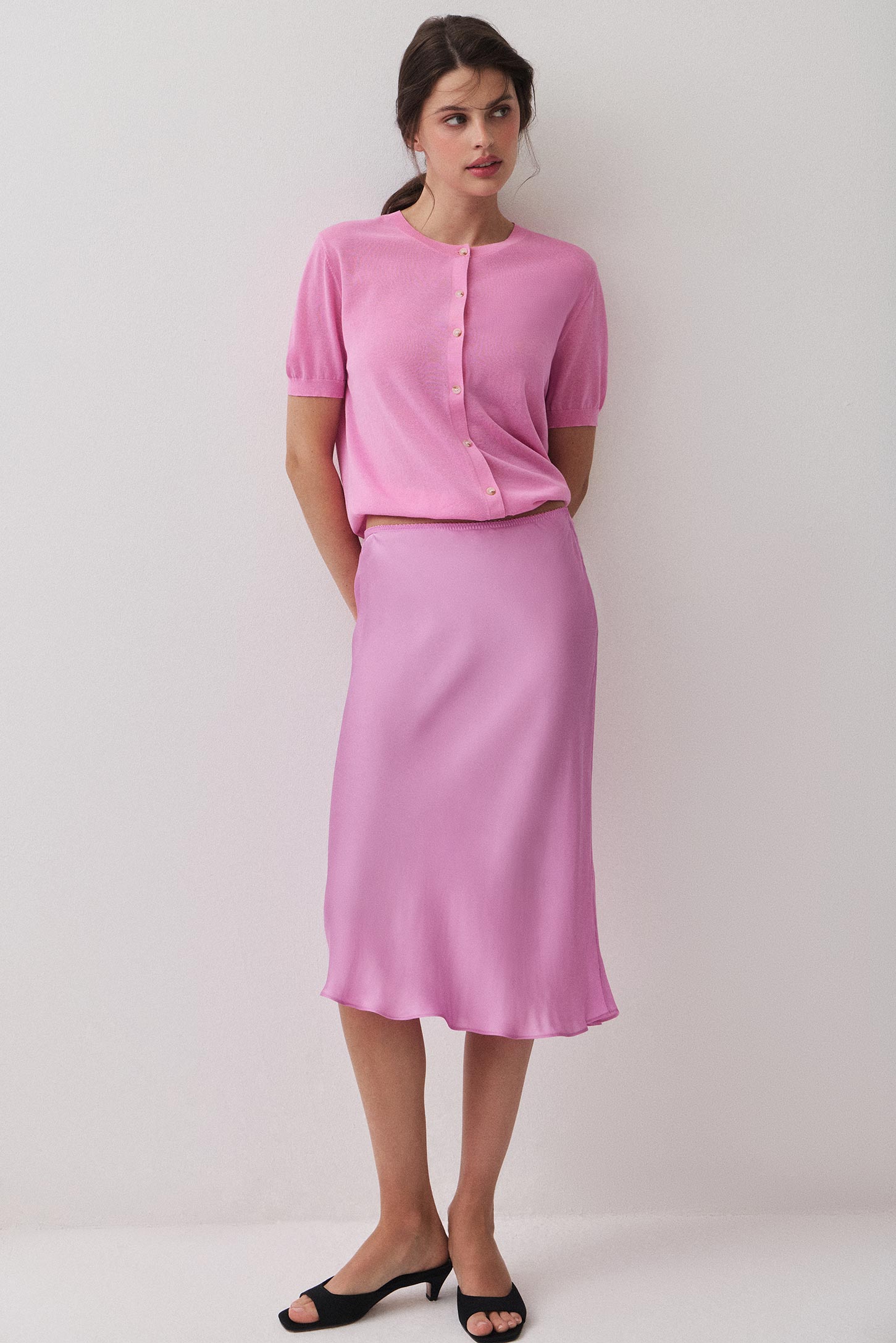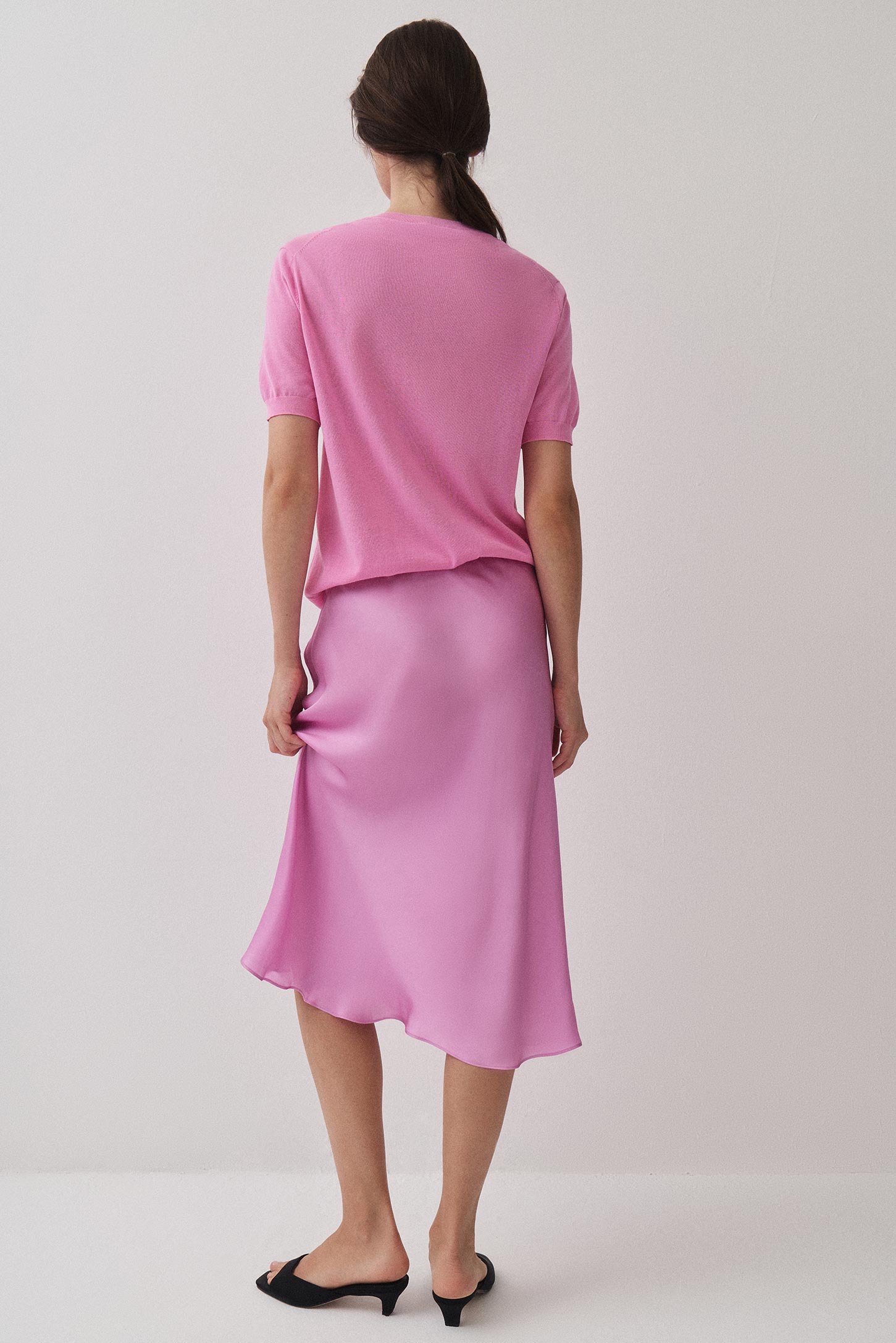 Юбка длины миди, скроена по косой, из тонкой сатиновой ткани с шелком в составе. Косой крой позволяет изделию идеально садится на разные типы фигур. Мягкая бельевая резинка с фестонами дает комфортную посадку ниже линии талии и деликатный вид изделию.