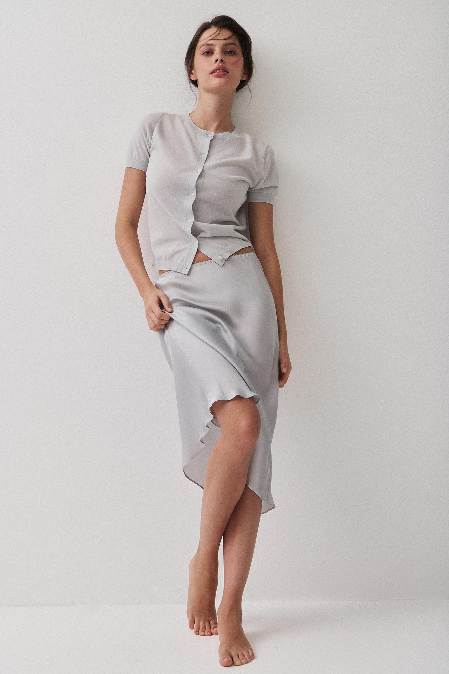 Юбка длины миди, скроена по косой, из тонкой сатиновой ткани с шелком в составе. Косой крой позволяет изделию идеально садится на разные типы фигур. Мягкая бельевая резинка с фестонами дает комфортную посадку ниже линии талии и деликатный вид изделию.