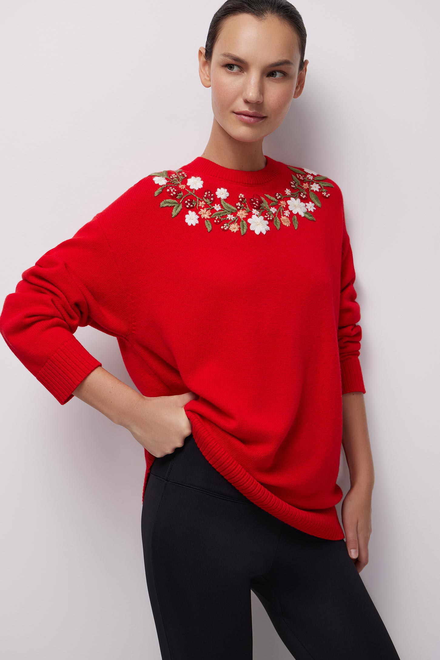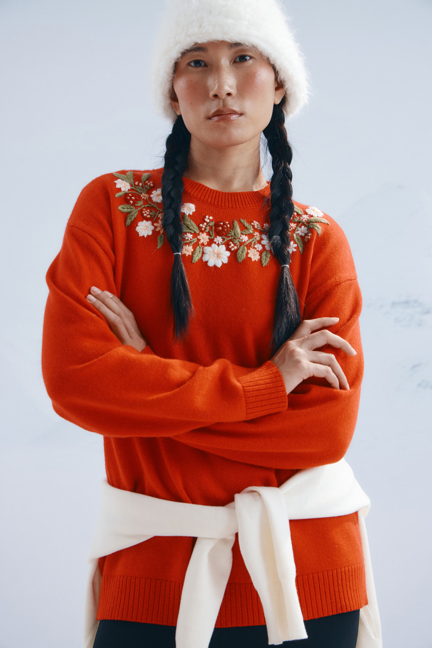 Вязаный джемпер оверсайз со спущенными рукавами и с круглой горловиной, обработанной рибом. На полочке, вдоль горловины выполнена машинная вышивка с эффектом ручной вышивки.