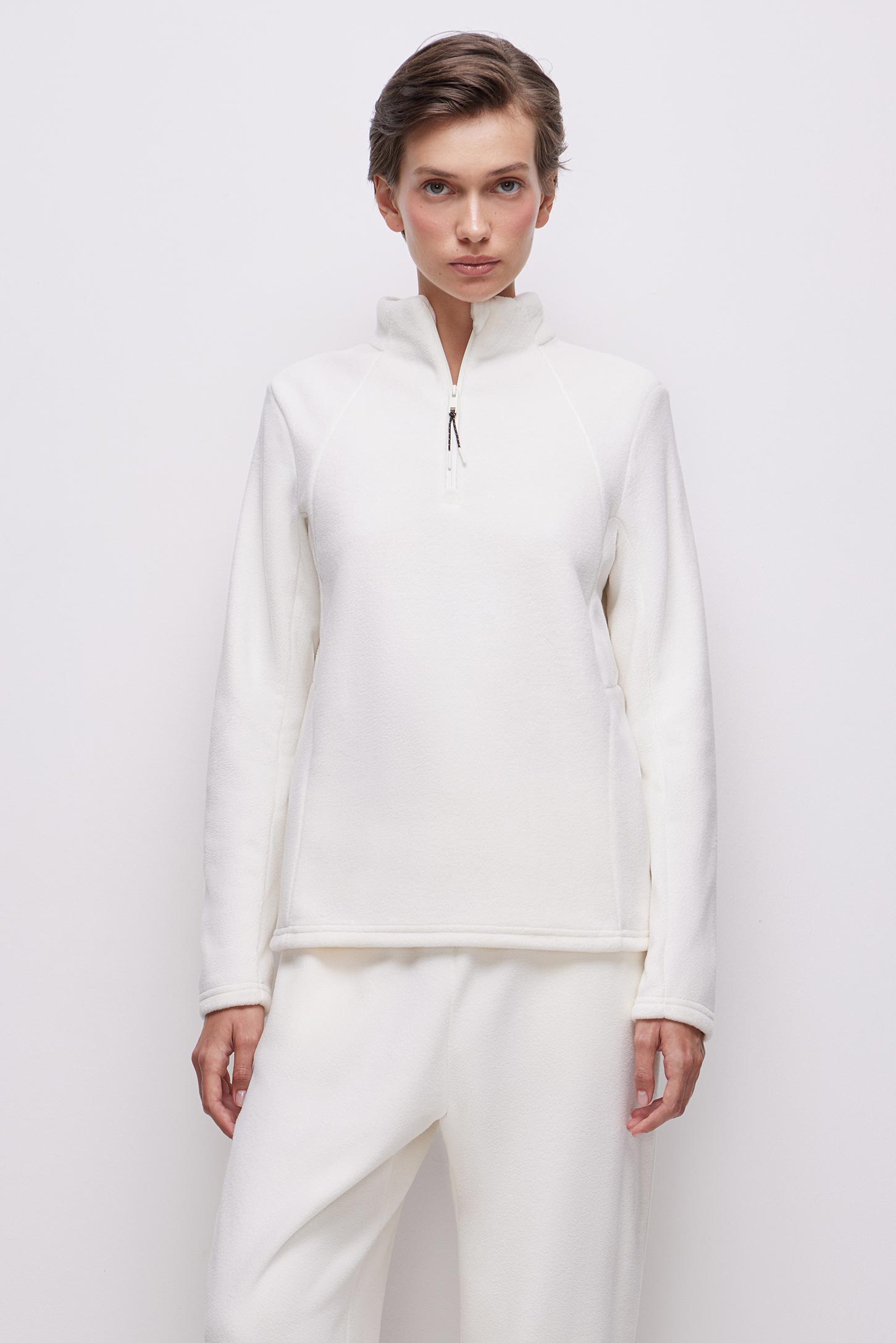 Лонгслив из мягкого флиса с укороченной молнией спереди станет идеальным дополнением для активных прогулок или спорта на свежем воздухе. Невысокий воротник-стойка защищает от ветра, а теплый эластичный материал и полуприлегающий крой создают комфорт.