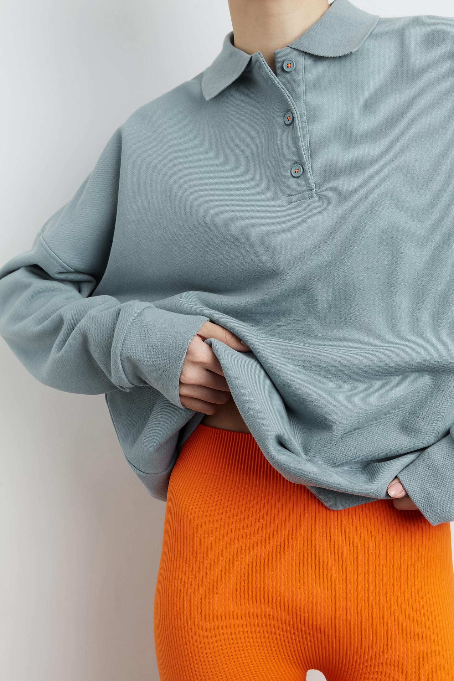 Толстовка с воротником-поло расслабленного силуэта. Воротник, низ изделия и рукава выполнены из риба. Планка с застежкой на 3 пуговицы, пришитыми контрастными нитками, что создает акцент. Изделие выполнено из гладкого футера.