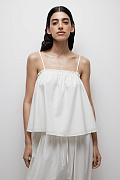 Топ расклешенный из тонкой хлопковой и формоустойчивой ткани со сборкой на резинку сверху и небольшой оборкой. Модель имеет тонкие регулируемые бретели для более корректной посадки. А мягкий натуральный материал