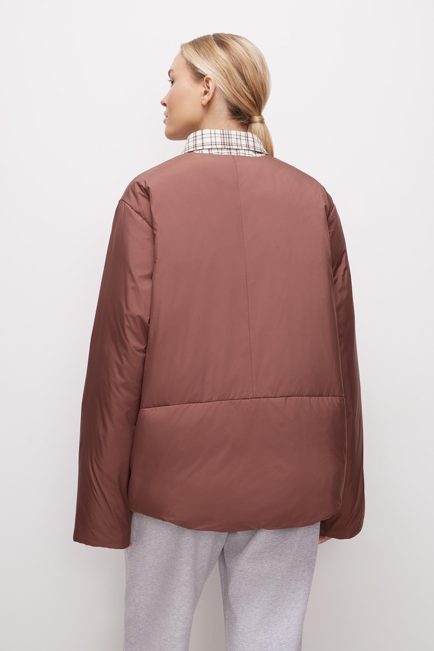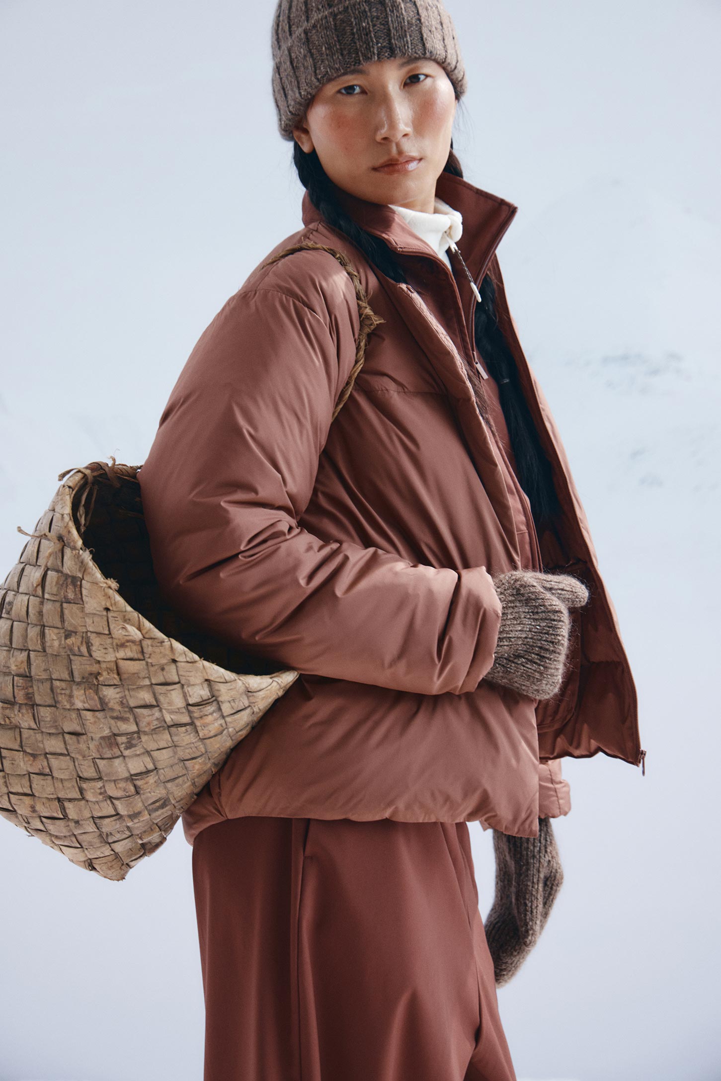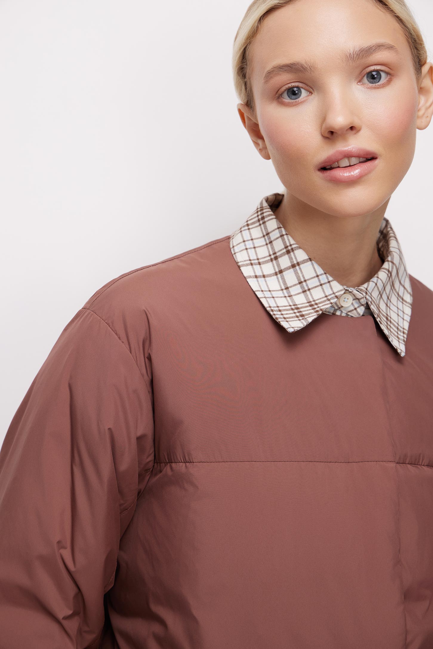 Пуховик прямого силуэта с округлой горловиной, с облегченным натуральным наполнителем 90% пух, 10% перо (“Light down”). Спущенная линия плеча, супатная центральная застежка на молнии, прорезные карманы спереди. В комплекте идет брендированный мешочек для хранения из основной ткани.