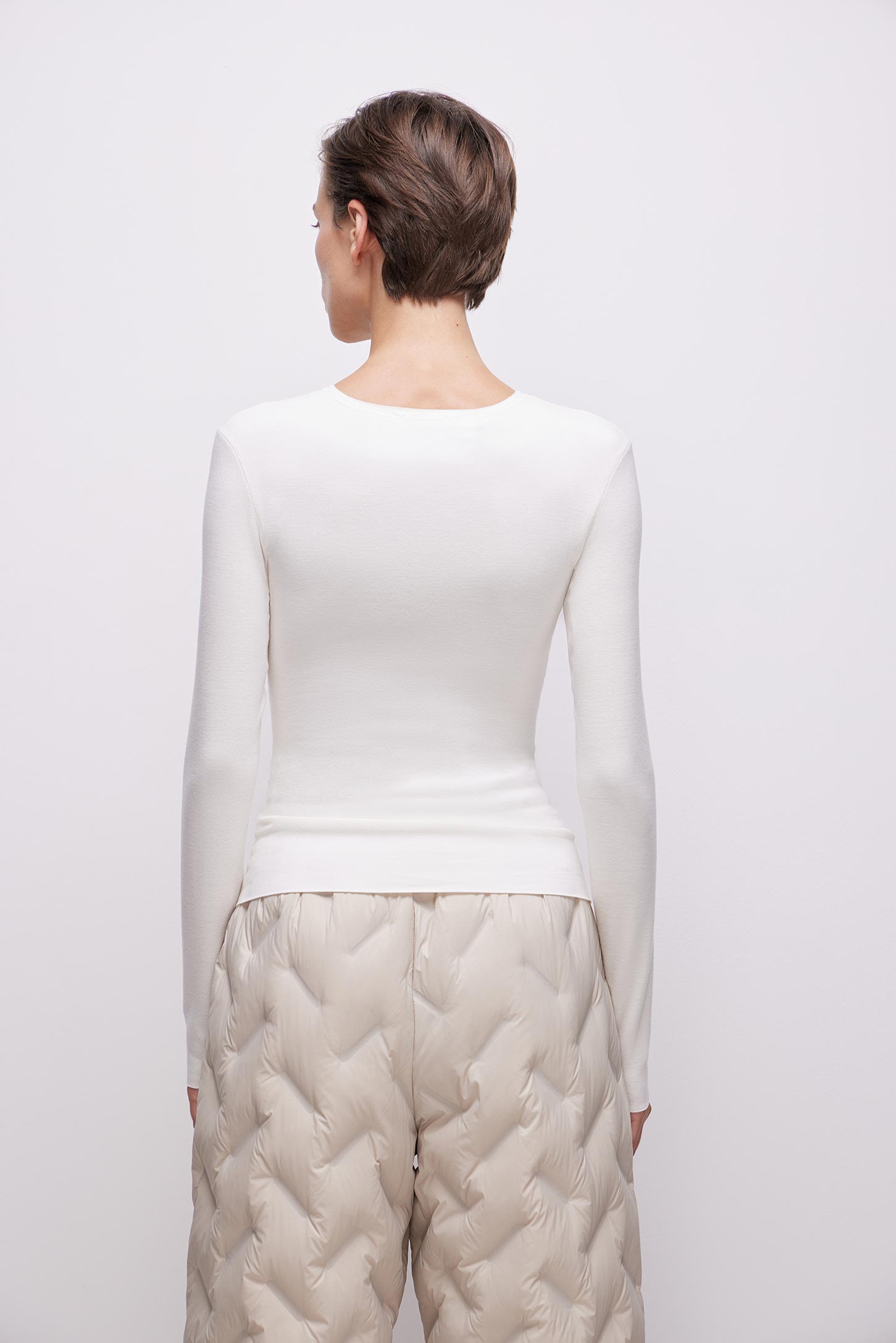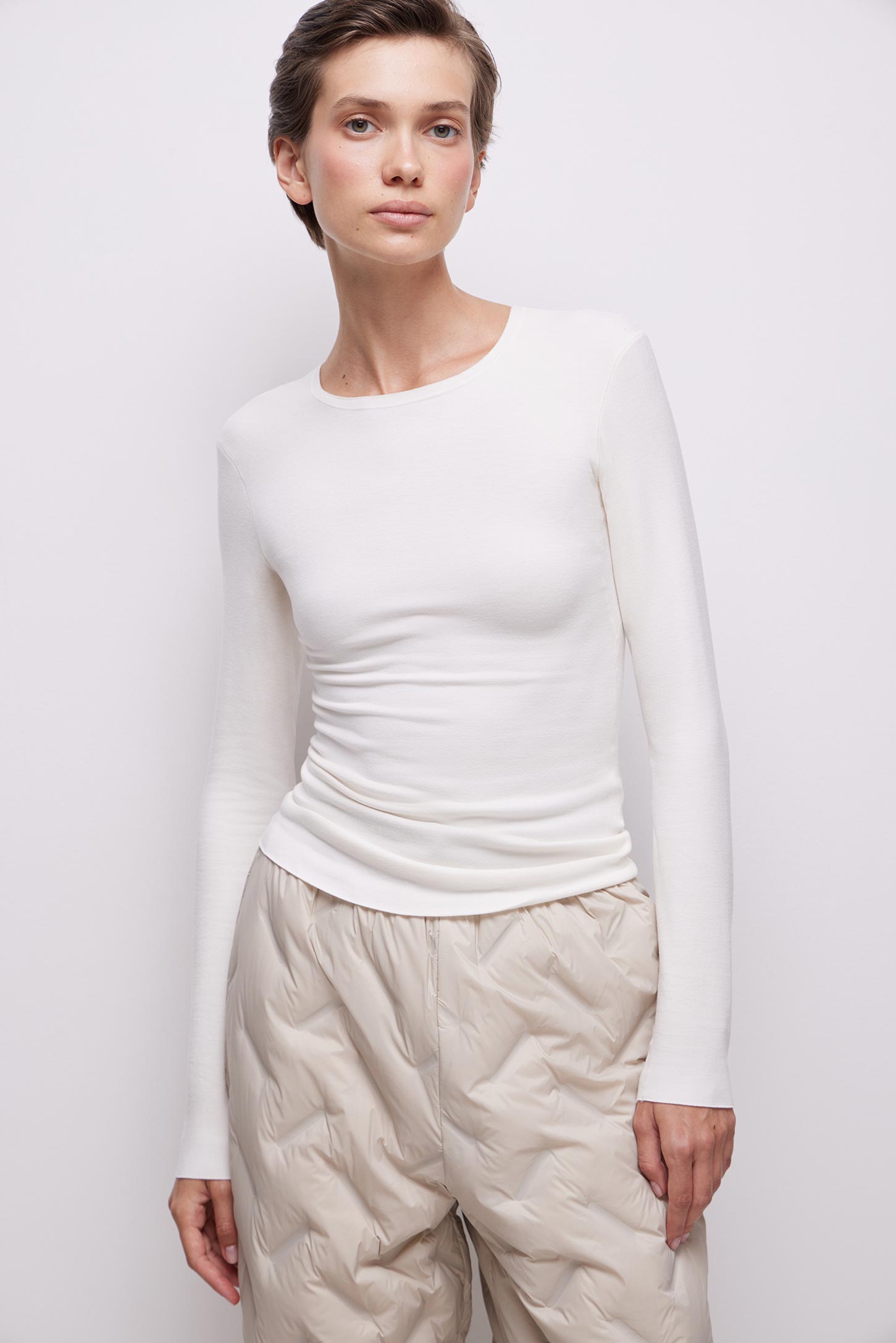 Трикотажный лонгслив приталенного силуэта подходит в качестве первого слоя в прохладную погоду. Мягкая ткань приятна на ощупь и не сковывает движения. Горловина, низ рукава и изделия обработаны лазером. Рекомендуется дополнить лонгслив легинсами W4060023 из этого же материала.