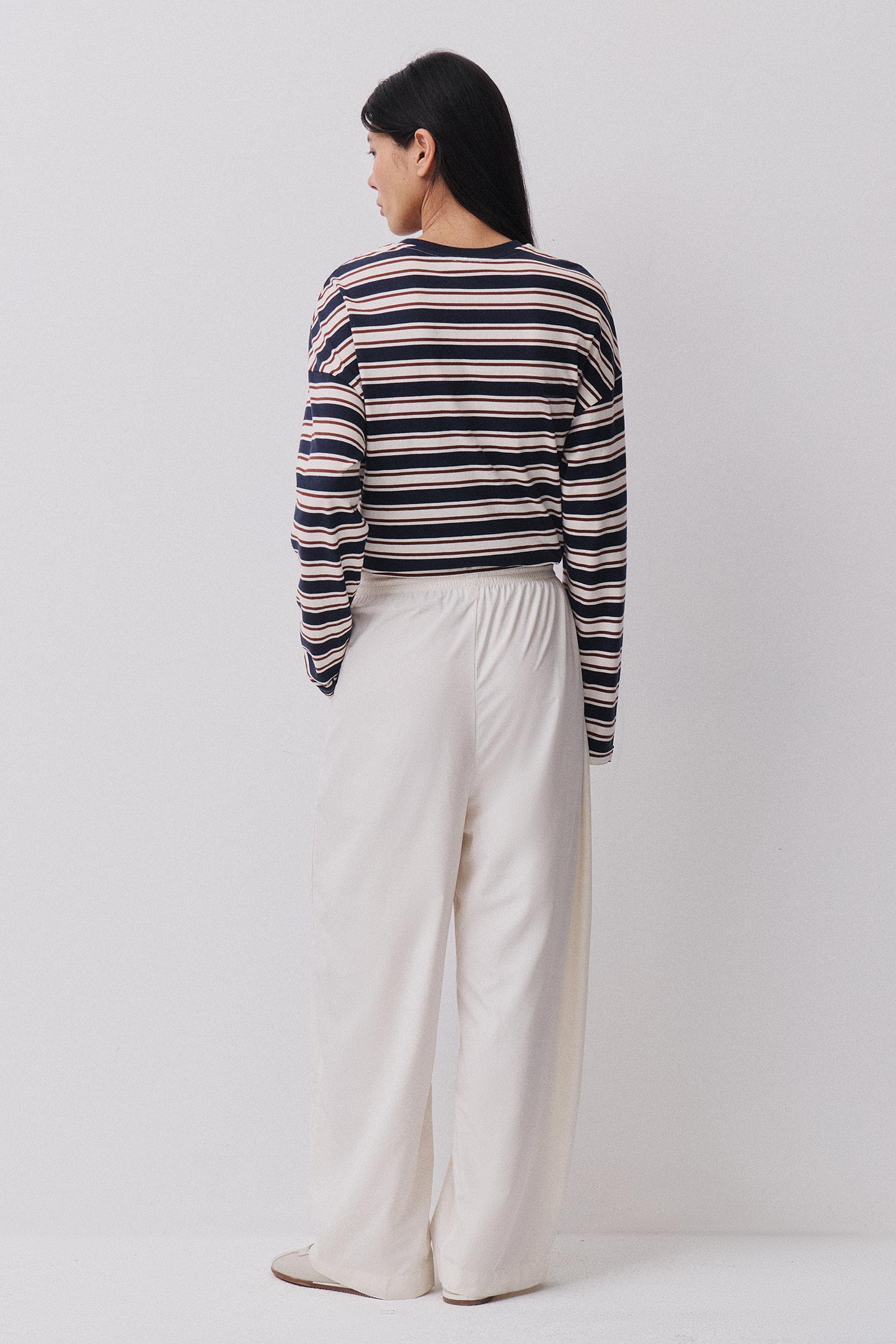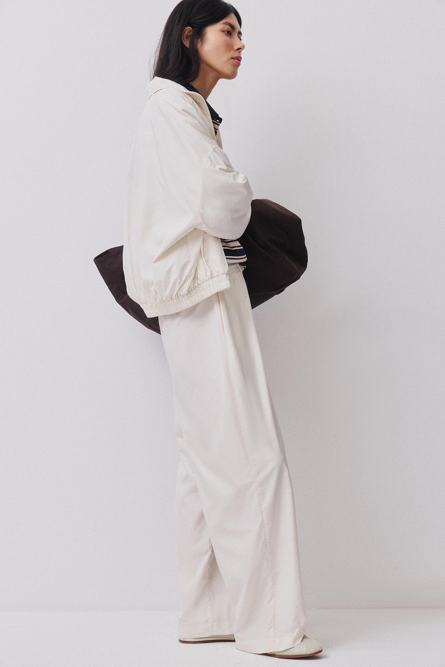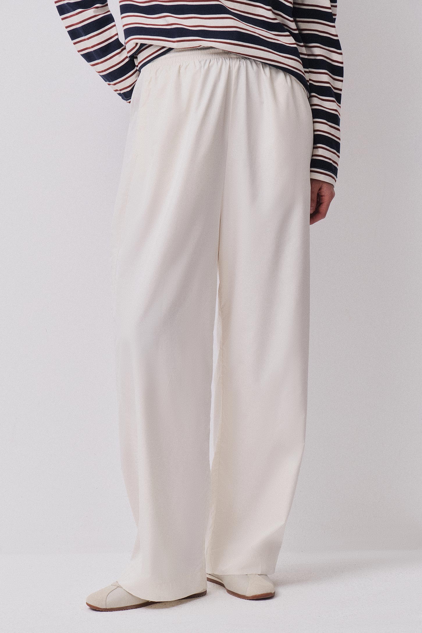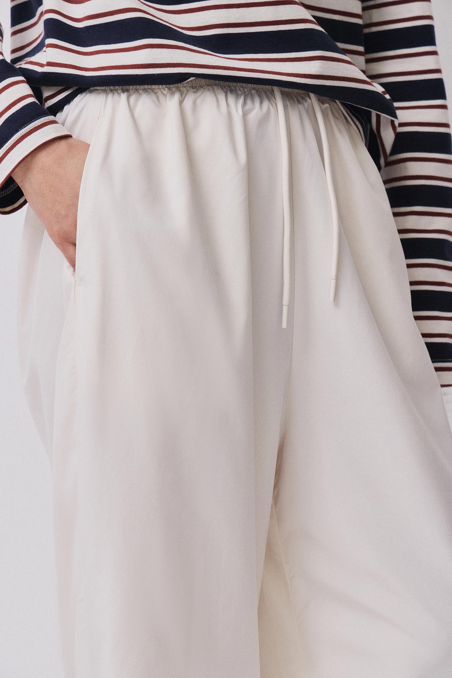 Брюки свободного силуэта из легкой плащевой ткани на широкой резинке с карманами в боковых швах. Швы с изнанки обработаны окантовкой из основной ткани, что придает изделию максимально завершенный и аккуратный вид. Декоративный шнур по поясу модели дает дополнительную фиксацию по талии и служит акцентом.