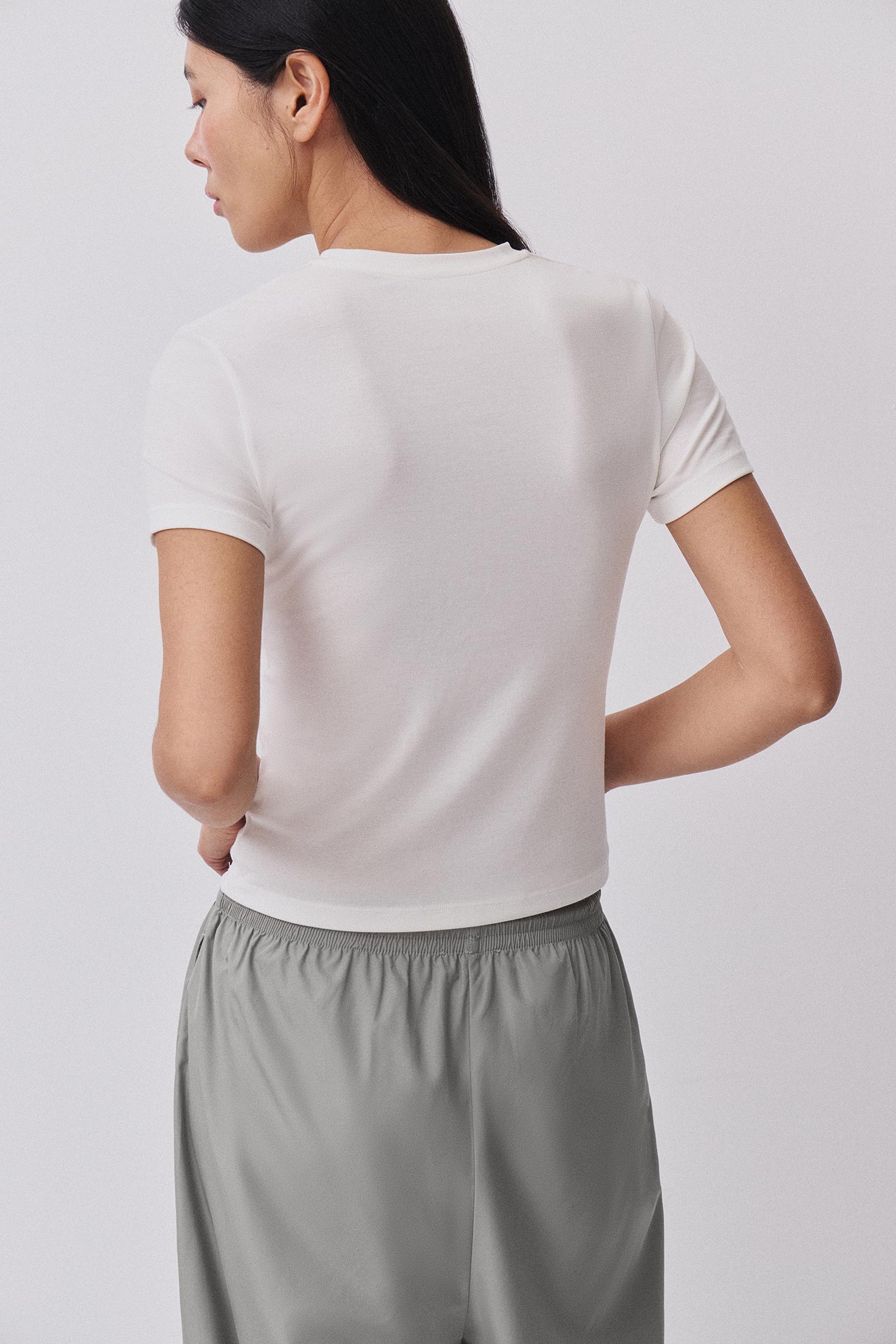 Футболка приталенного силуэта из тонкого струящегося лиоцелла. Горловина выполнена из основной ткани.