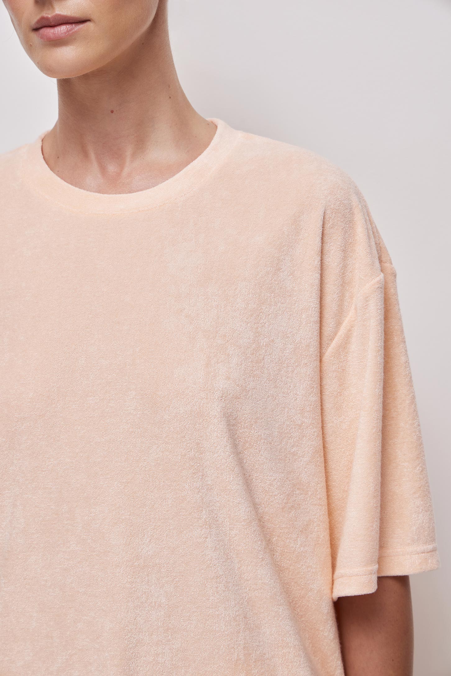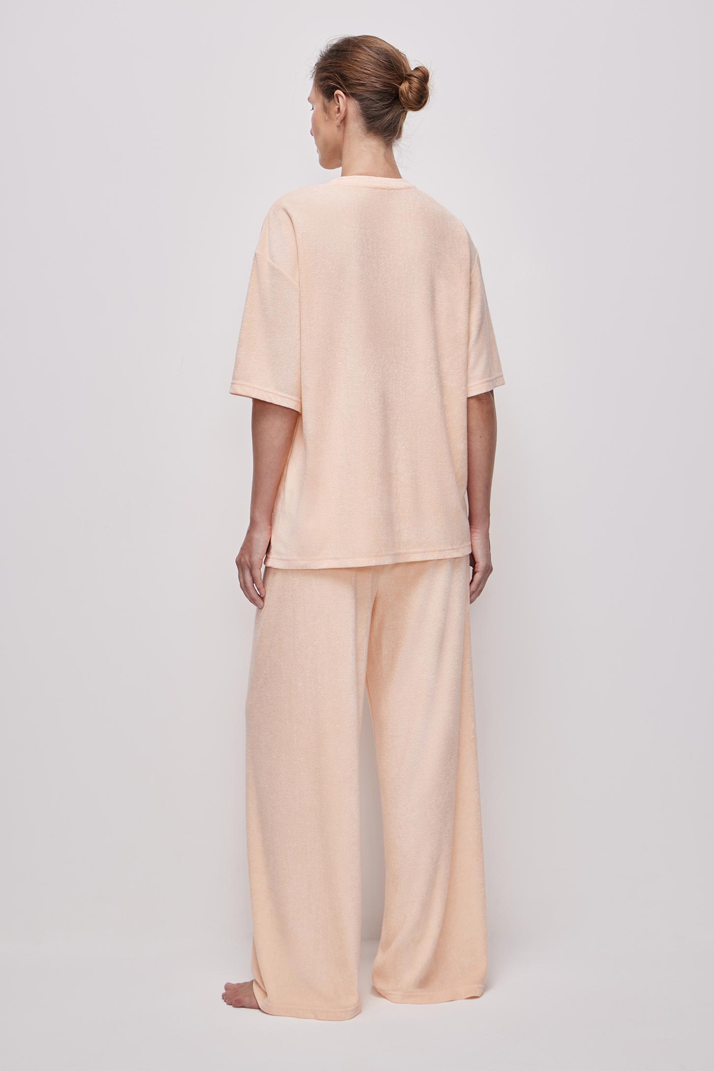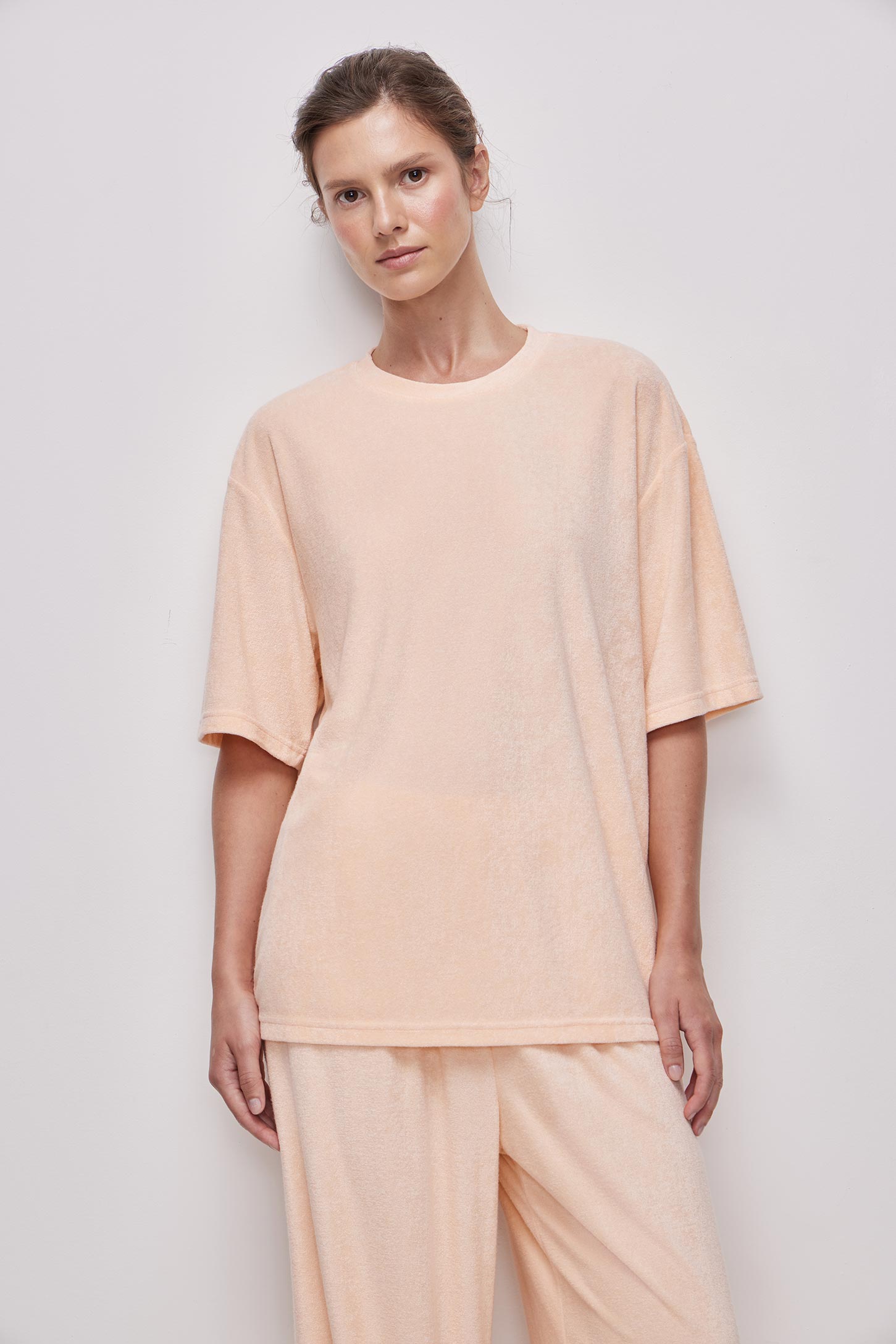Пижамная футболка прямого силуэта из тонкой махры, приятной на ощупь. Расслабленный силуэт не сковывает движения, подходит для разных типов фигуры и обеспечивает свободу и удобство. Модель имеет круглую горловину с аккуратной обработкой сохраняет форму после стирок.