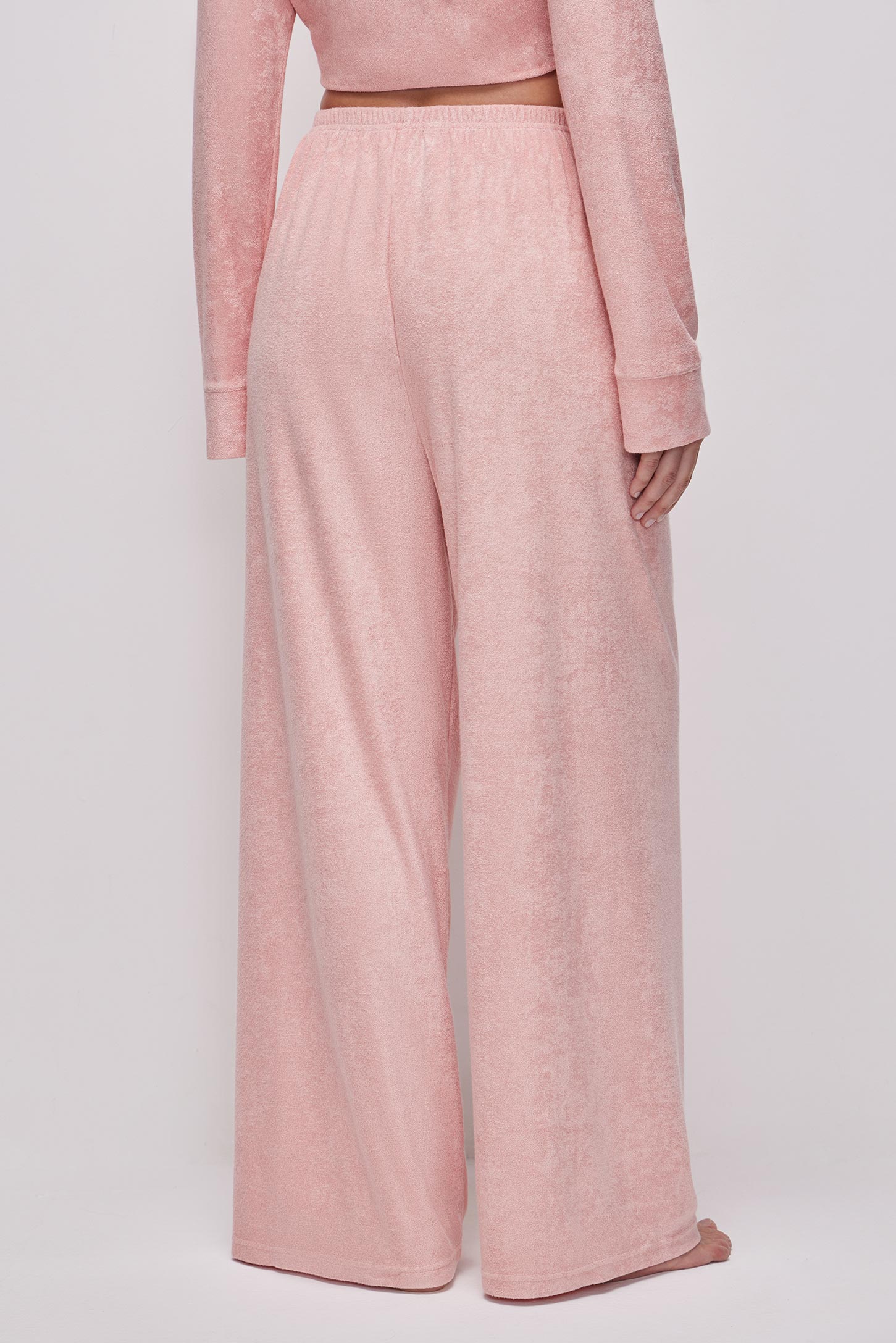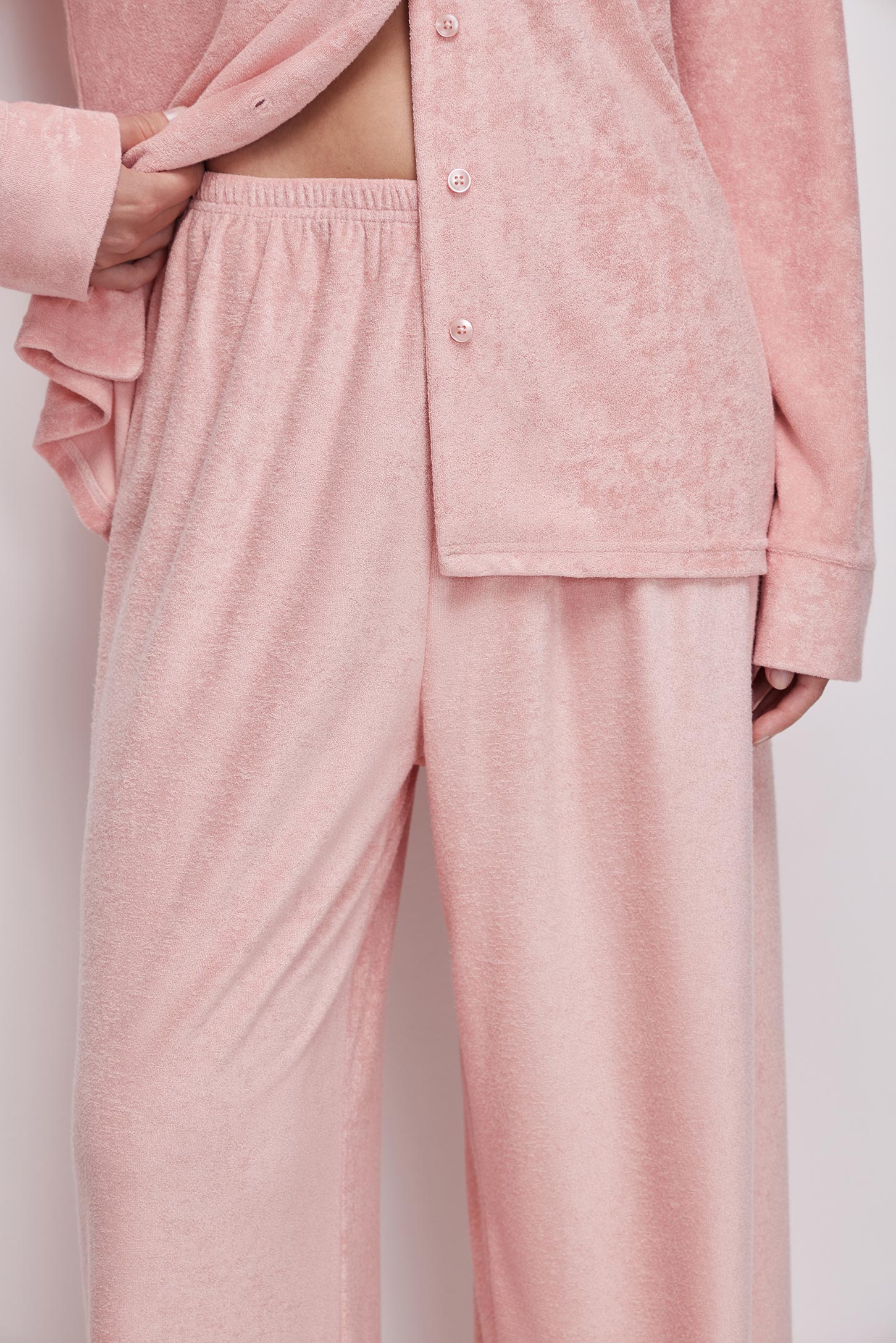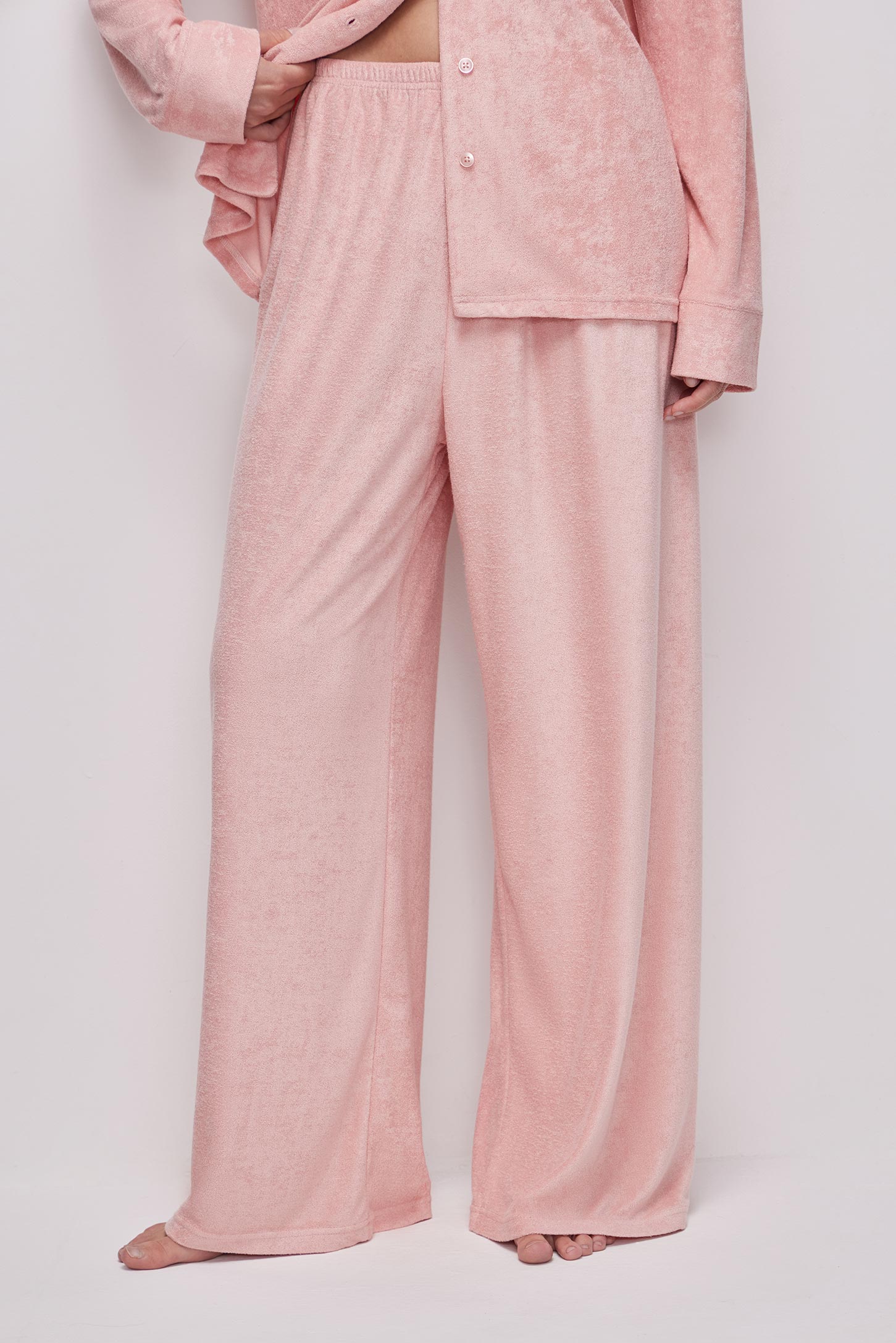 Пижамные брюки прямого силуэта из тонкой махры приятной на ощупь. Эластичный пояс на резинке равномерно фиксирует изделие и обеспечивает удобную посадку без давления. Прямой силуэт визуально вытягивает ноги и не сковывает движений. Посадка на талии обеспечивает комфорт и универсальность.