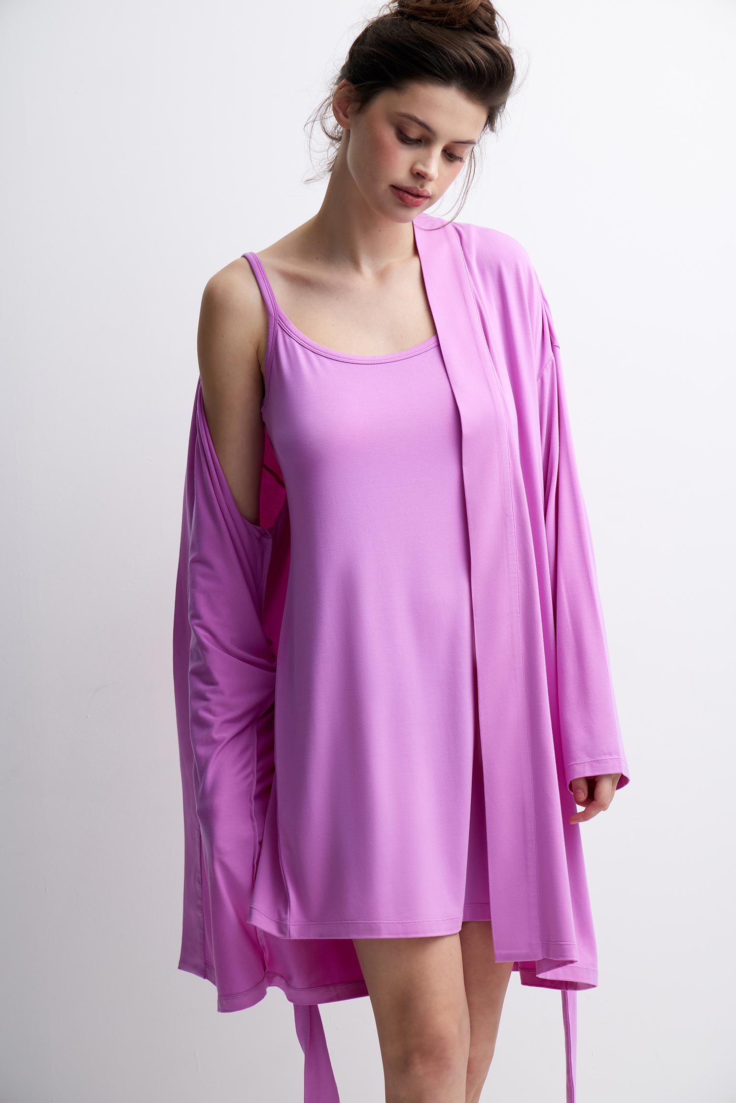 Сорочка из мягкого трикотажного бамбукового полотна, которое отличается высокой воздухопроницаемостью, гипоаллергенностью и способностью отводить влагу, обеспечивая комфорт в течении дня. Полуприлегающий силуэт подчеркивает фигуру, не сковывая движений. Тонкие нерегулируемые бретели обеспечивают нежный и минималистичный внешний вид. Длина мини открывает ноги и создает легкий, женственный образ.