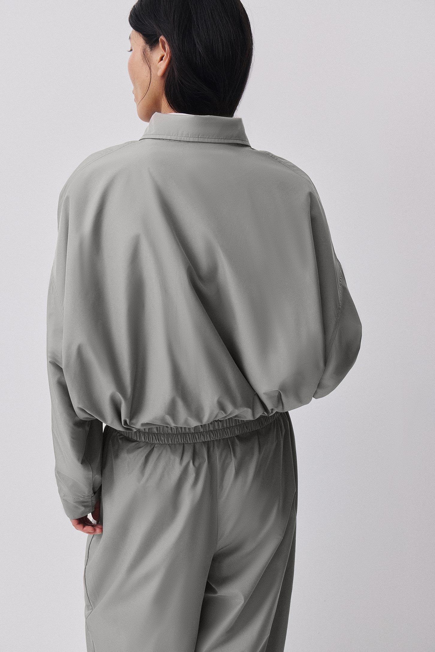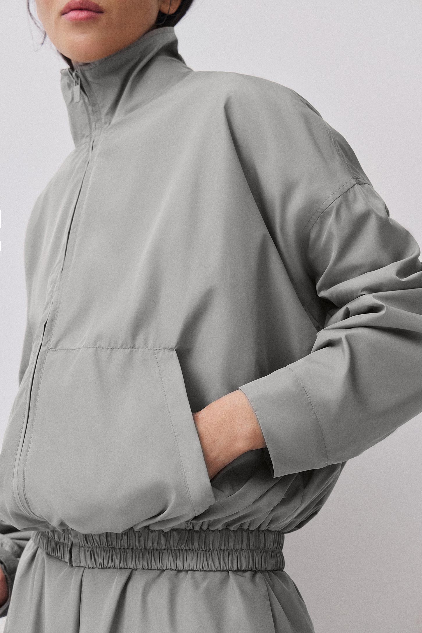 Ветровка -бомбер объемного силуэта с воротником-стойкой и карманом-кенгуру. Изделие из плащевой ткани на подкладке. Модель на застежке-молнии со спущенной линией плеча. Резинка по низу изделия, рукава дополнены патами на кнопках, что позволяет регулировать ширину рукава по низу.