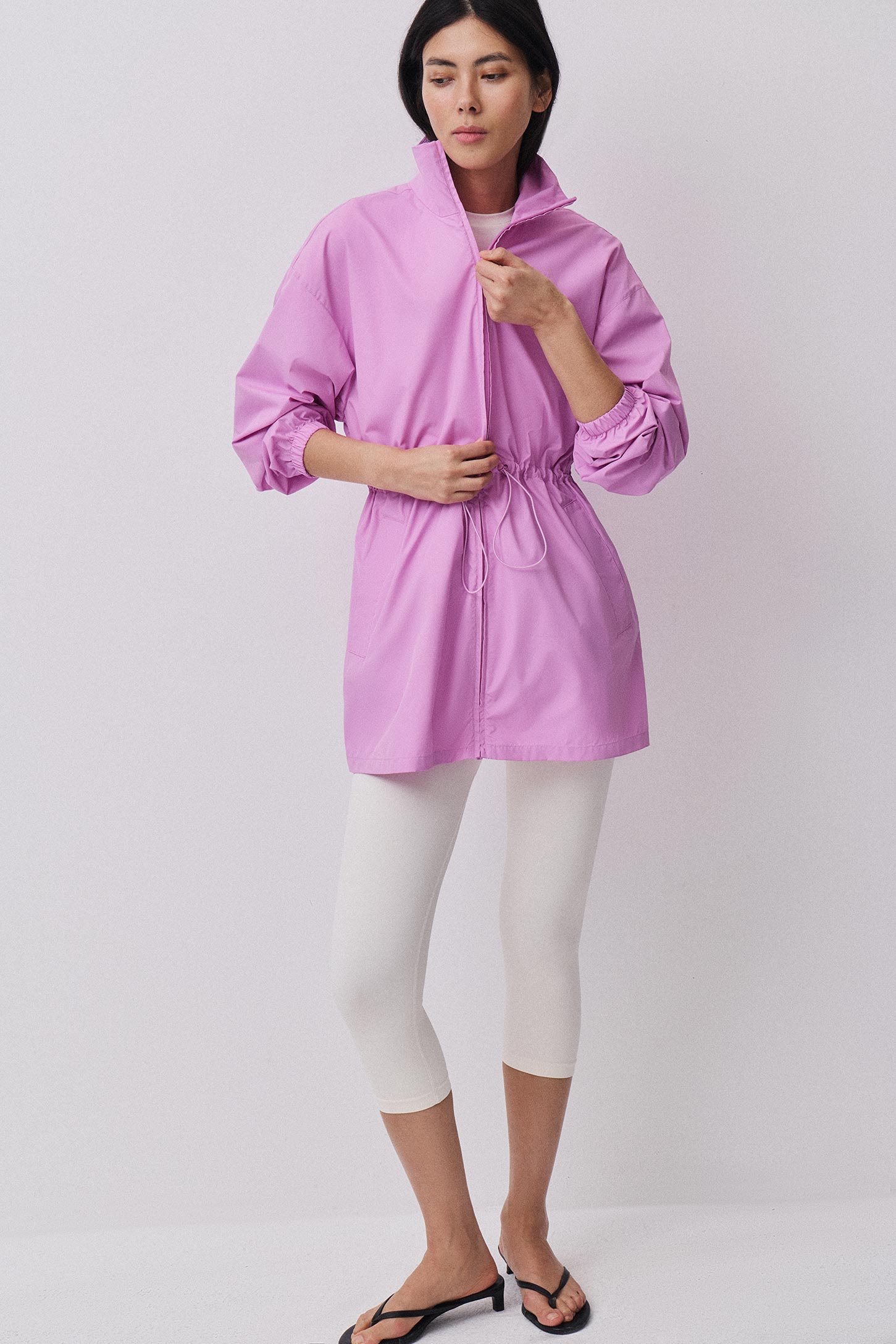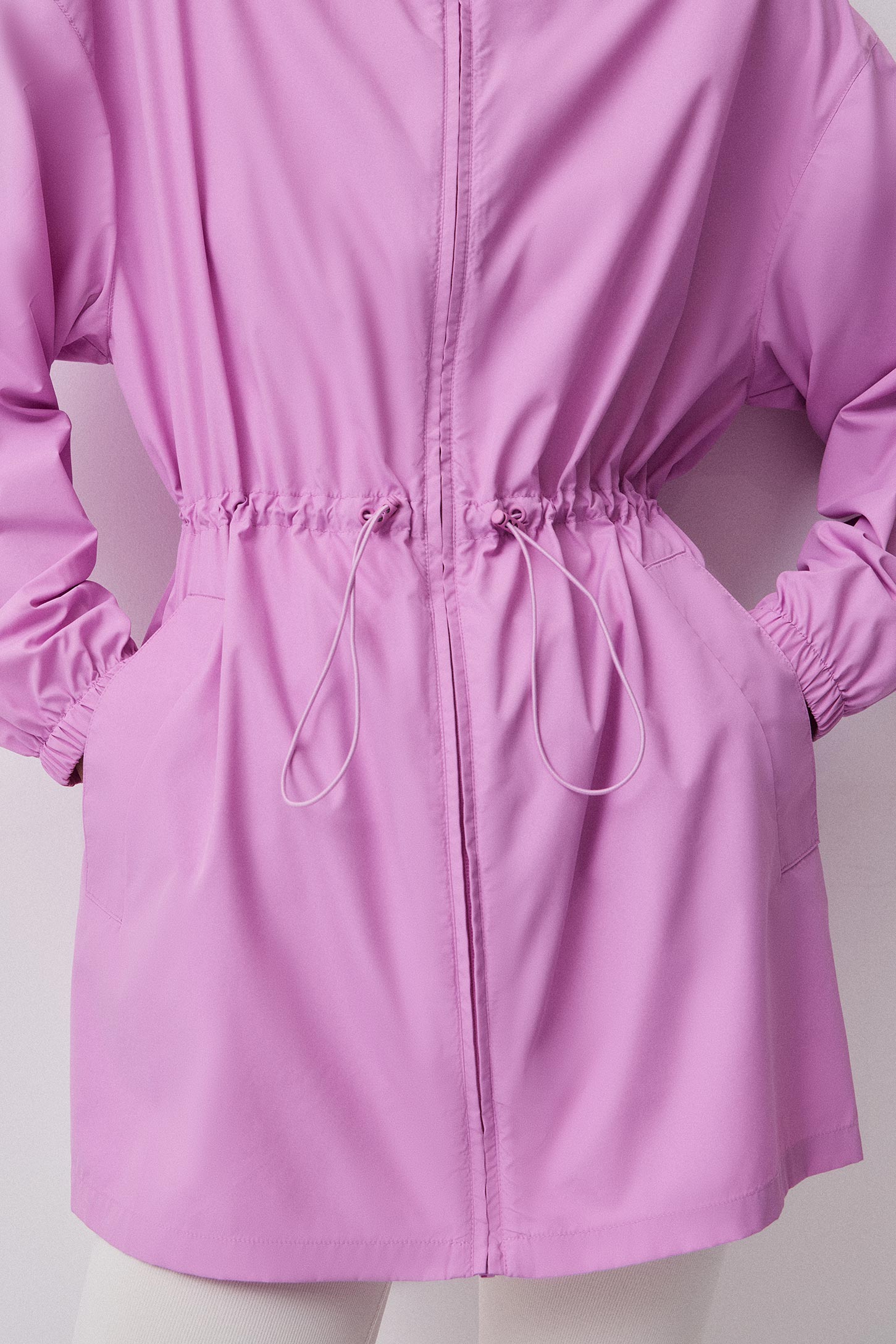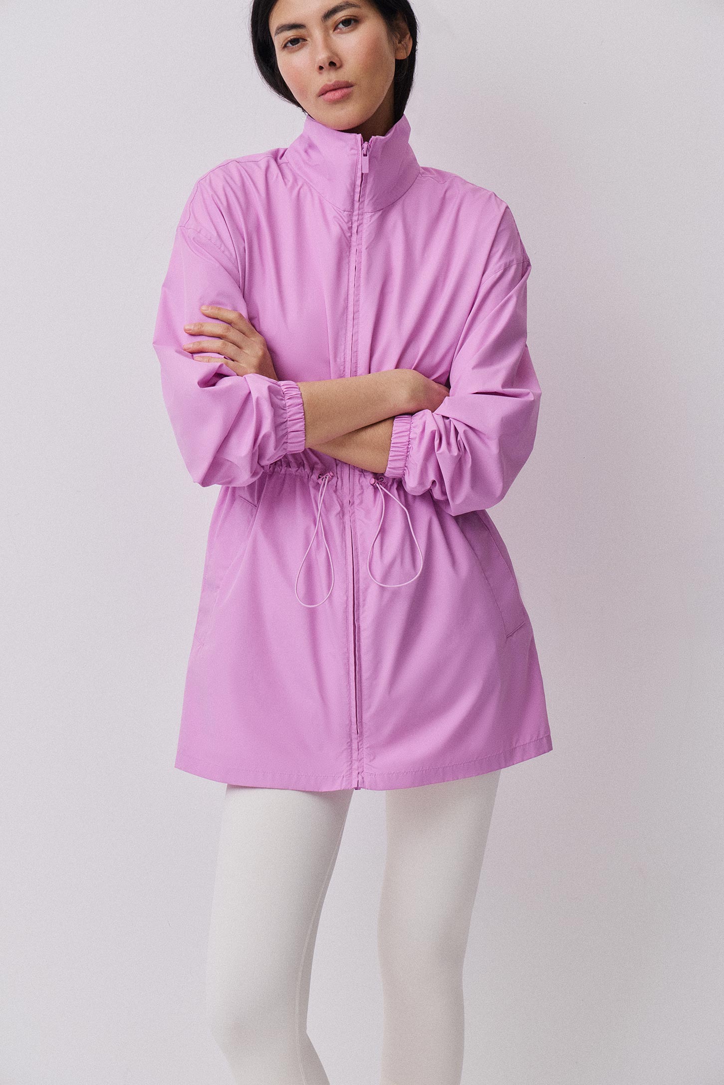 Удлиненная ветровка свободного силуэта на молнии, с воротником- стойкой. Кулиска на талии создает приталенный силуэт, благодаря эластичному шнуру cо стопперами. Рукава с резинкой по низу. Прорезные карманы с листочками спереди. Легкая, ветрозащитная ткань, устойчивая к дождю. Изделие без подкладки.