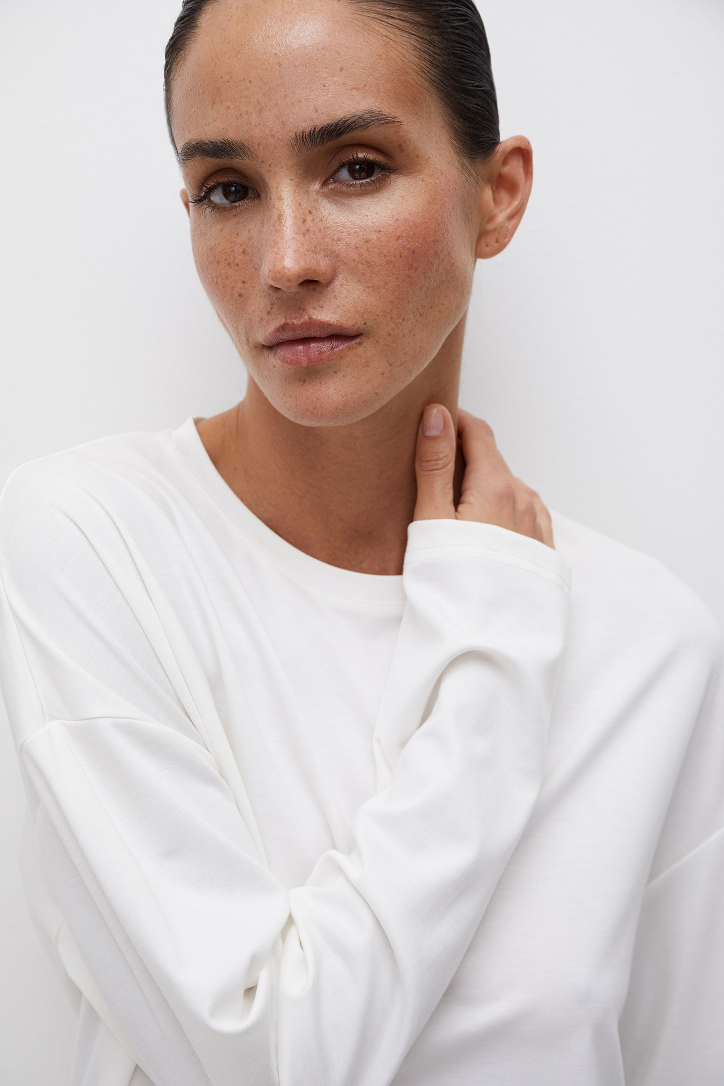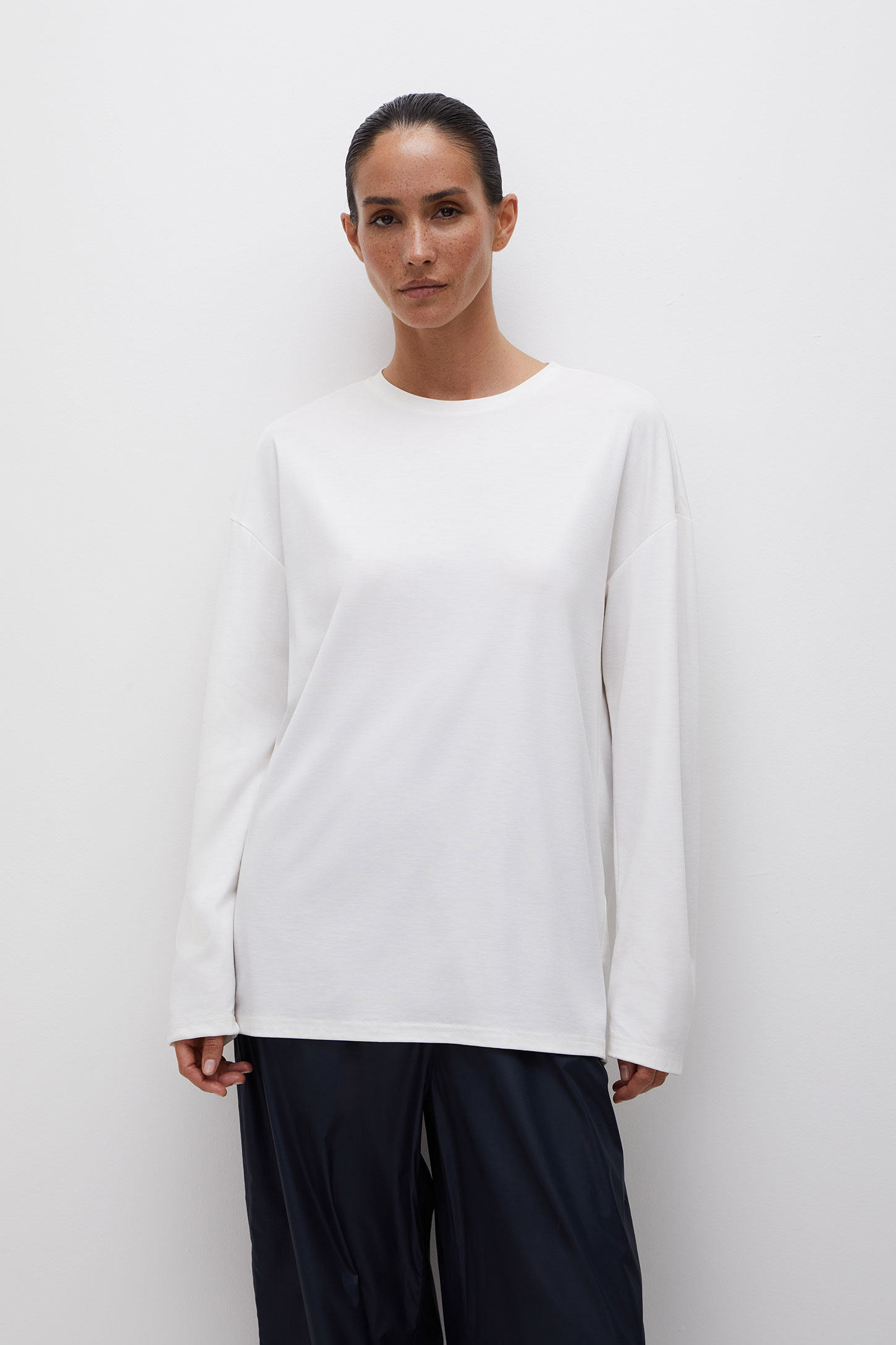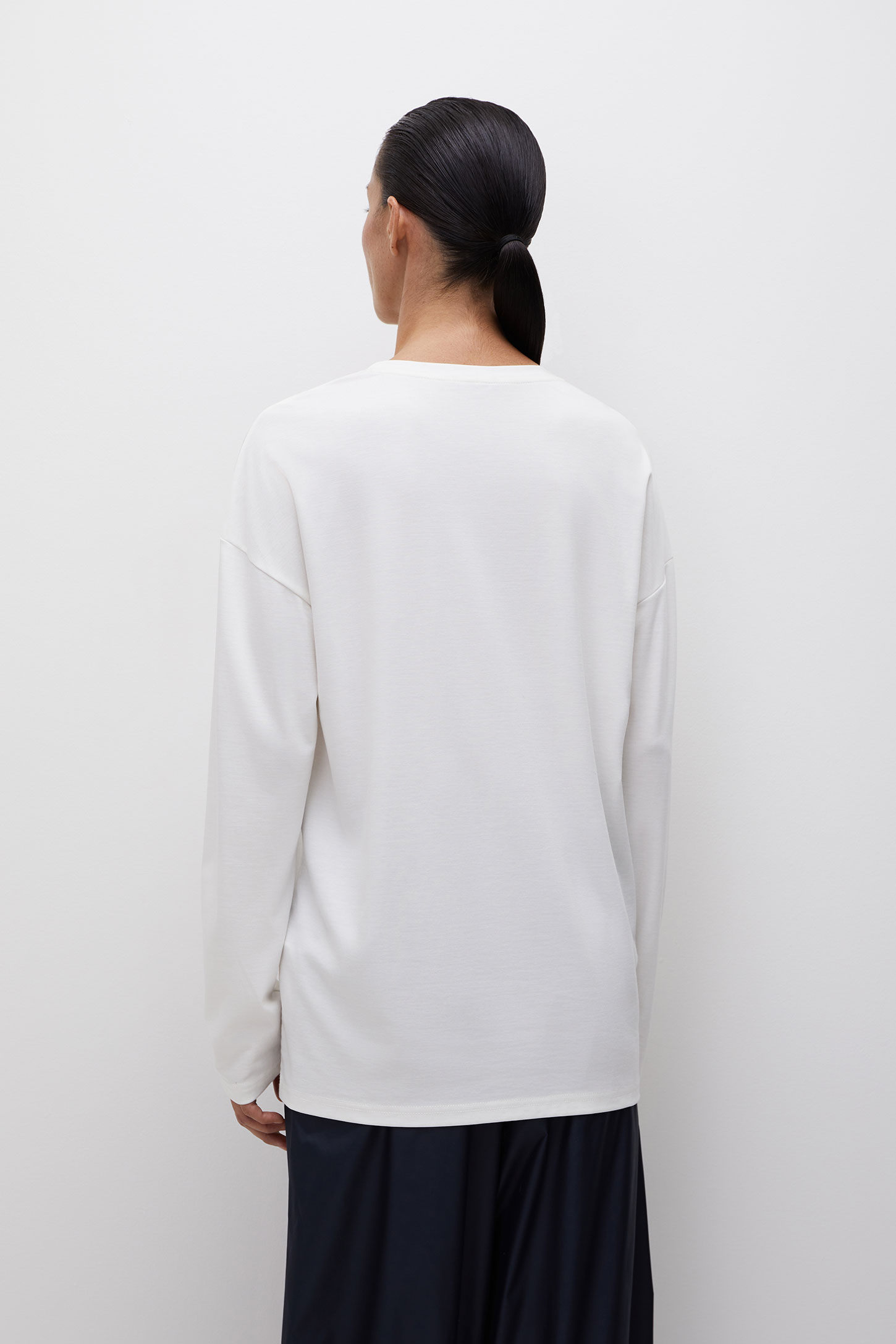 Лонгслив свободного силуэта со спущенной линией плеча изготовлен из гладкого и шелковистого трикотажного материала. Удлиненная модель дарит ощущение свободы и расслабленности. Сочетайте изделие с легинсами и велосипедками из трикотажа, а также брюками и шортами из гладкой ткани.
