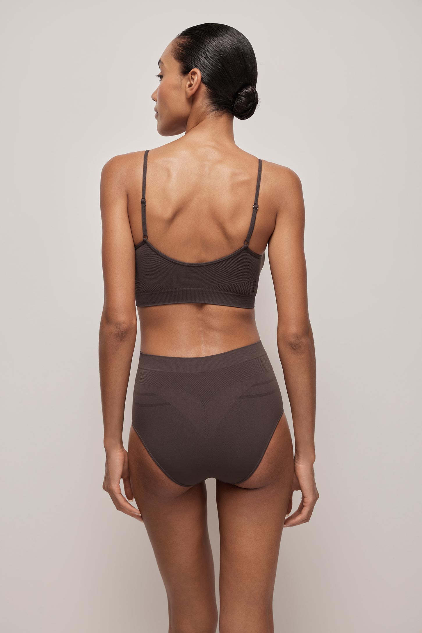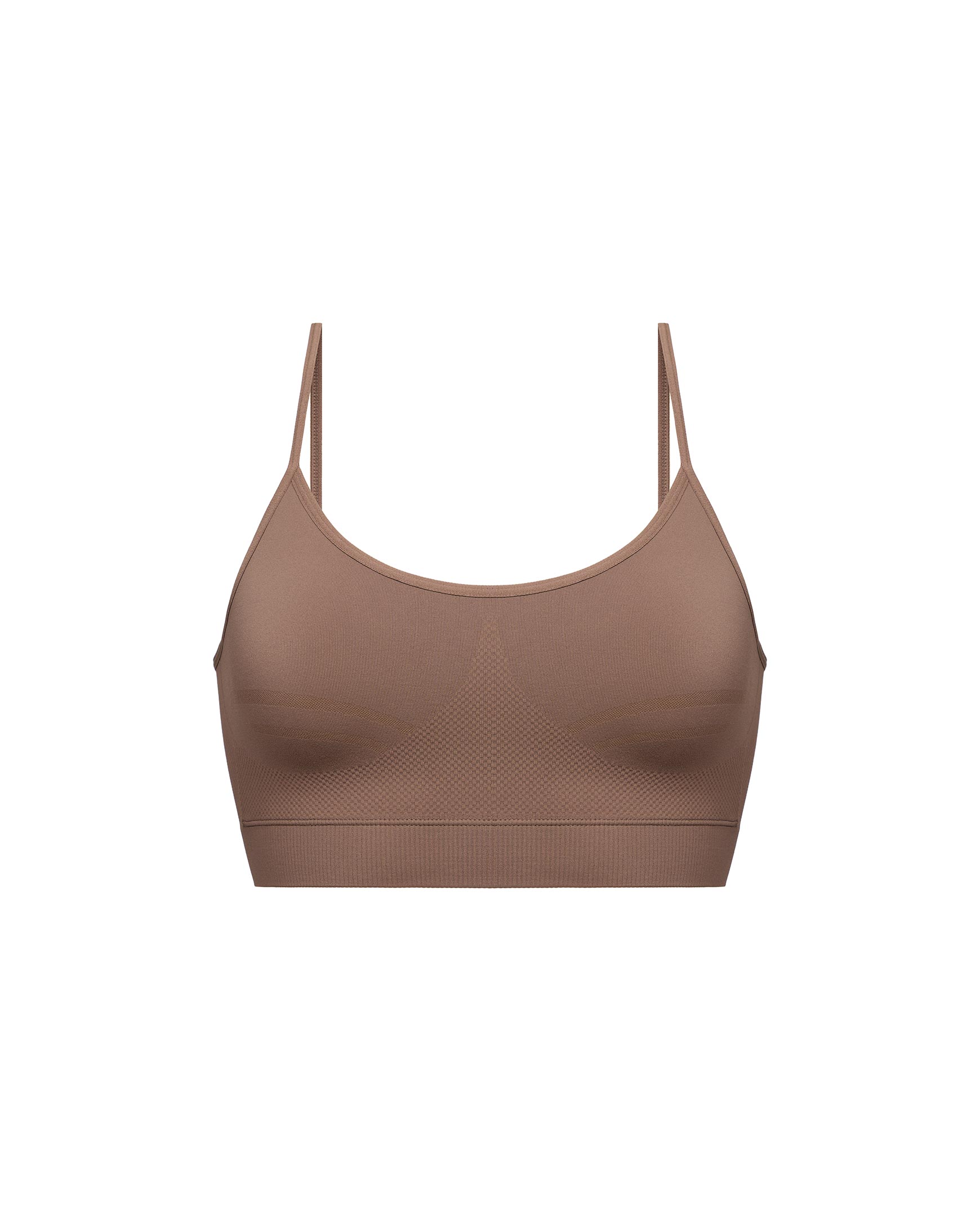 Шелковистый топ на тонких бретелях из микрофибры выполнен по бесшовной технологии. Для наибольшего комфорта и поддержки топ имеет вставки в рубчик на спине и цельновязанную резинку под грудью. Модель дополнена съемными чашками-вкладышами. Отличный вариант для повседневной носки, когда требуется лёгкая поддержка груди и свобода движений. Подходит для чашки А В С.