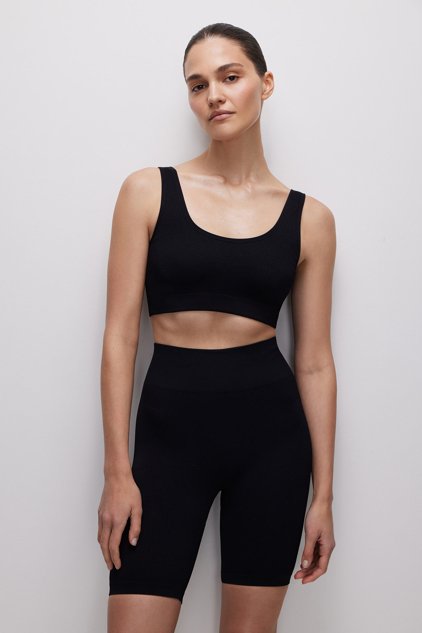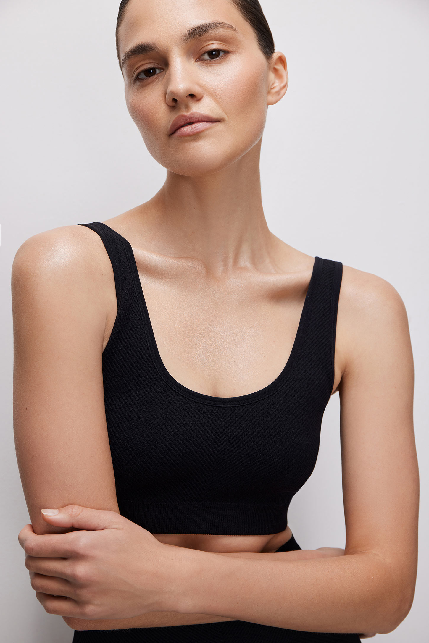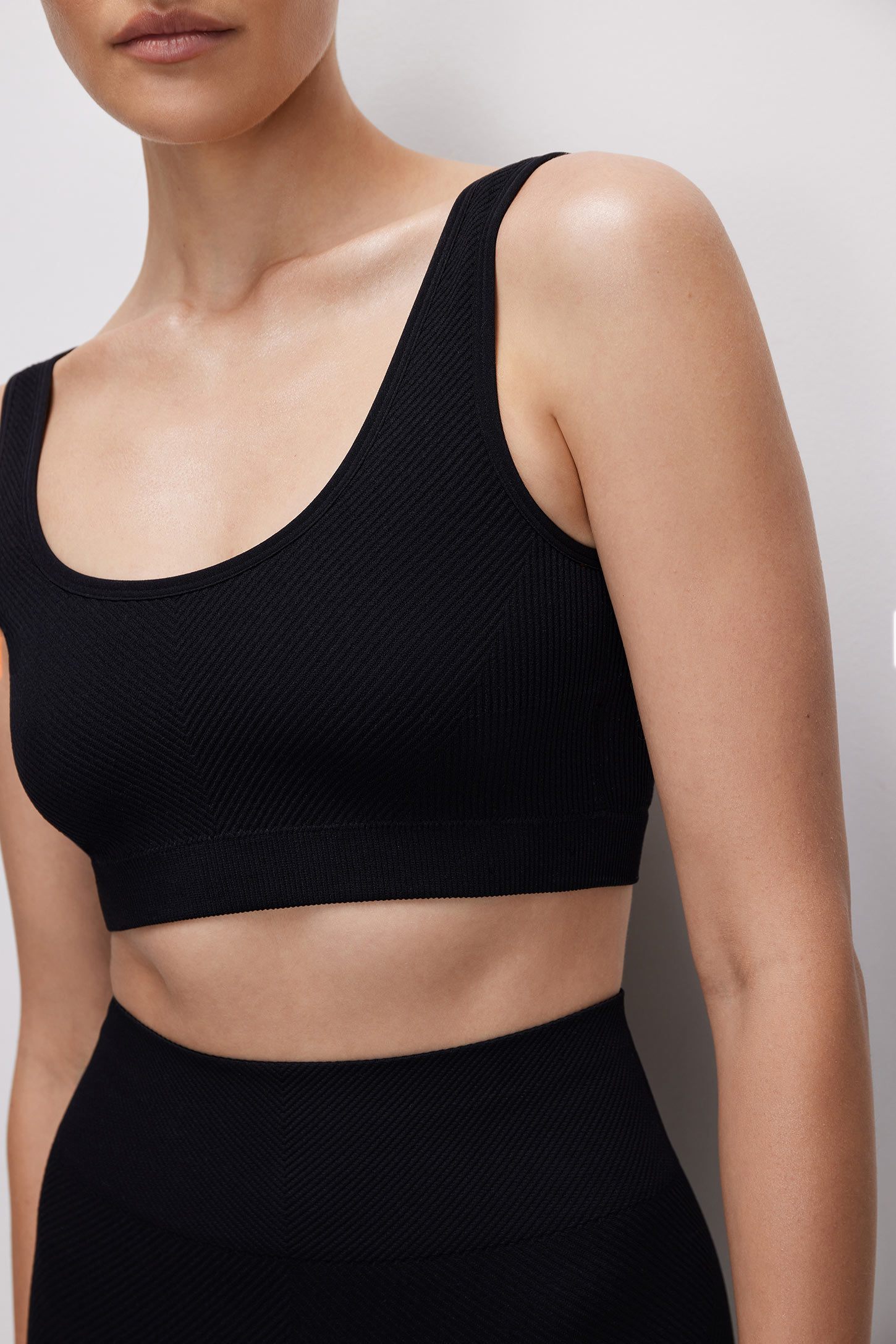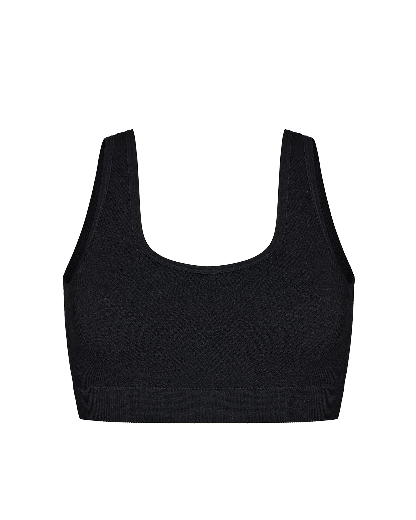 Спортивный топ на широких бретелях из плотной микрофибры в диагональный рубчик выполнен по современной технологии без боковых швов. Благодаря упругой резинке в рубчик по низу топ комфортно облегает фигуру и не сковывает движения. Съемные чашки-вкладыши