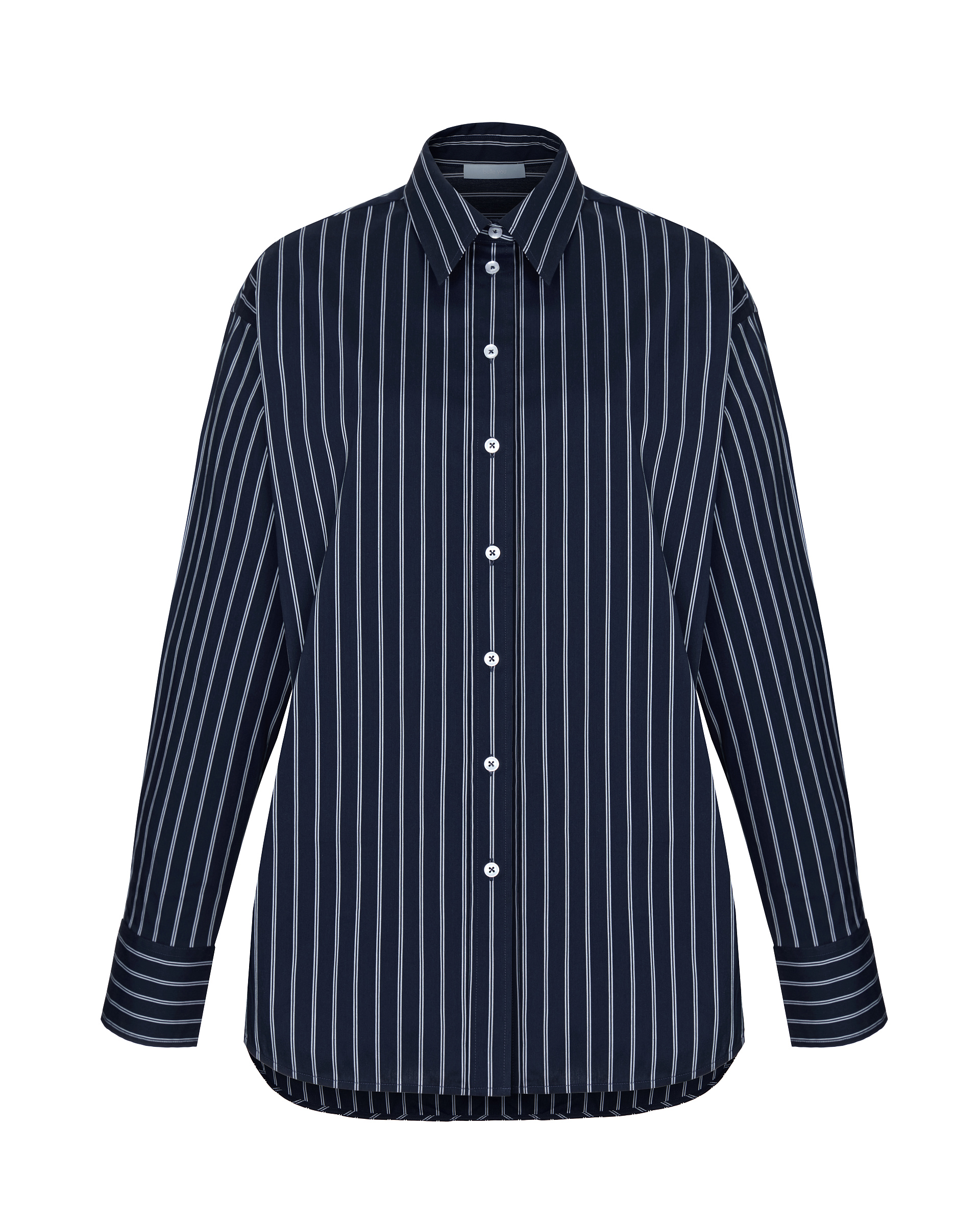 Объемная рубашка в полоску изготовлена из хлопкового поплина сконструирована по принципу мужской сорочки: классический воротник на стойке, планка с пуговицами, широкие манжеты, округлый низ изделия. Свободный удлиненный силуэт и спущенный рукав подарят невероятное ощущение комфорта. Элементы мужской сорочки подчеркнут хрупкость и женственность. Благодаря добавлению синтетических волокон в состав ткани изделие практически не мнется. Сочетайте рубашку с брюками и шортами из поплина. Такие комплекты идеально подойдут для создания расслабленных домашних и повседневных городских образов.
